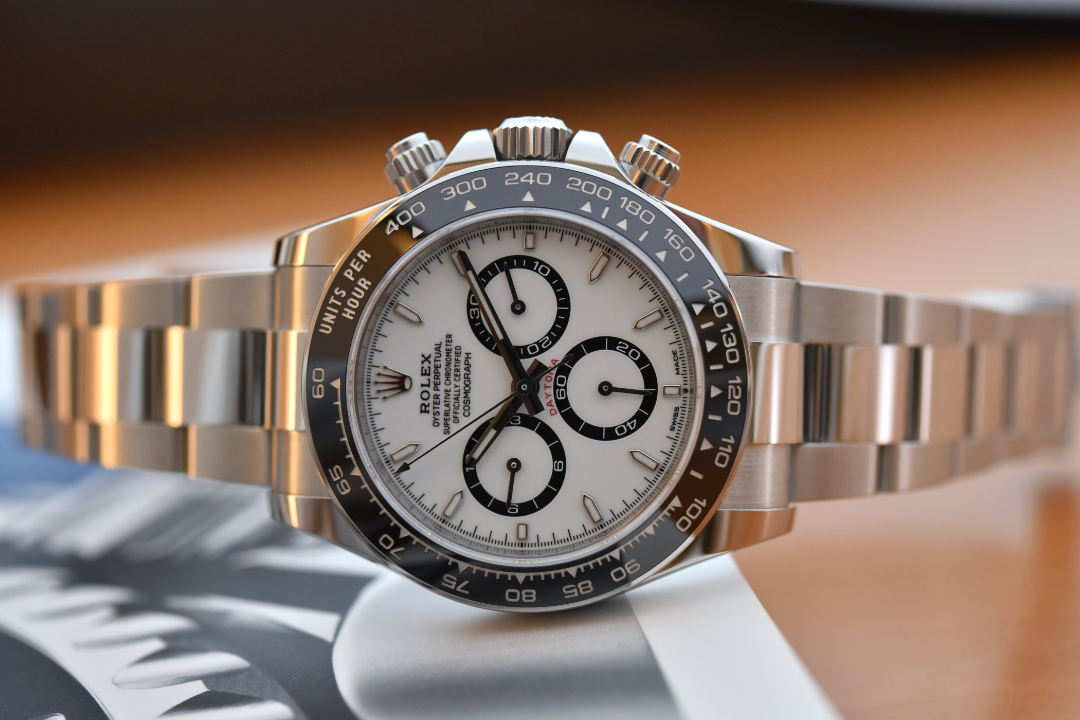 Quick Facts – 40mm x 11.90mm – Oystersteel monobloc case, brushed & polished – sapphire crystal on top – solid caseback – Triplock screw-down crown and pushers – black Cerachrom bezel with tachymetric scale – white dial with black rings for the subdials – applied indices & hands with Chromalight – red “Daytona” mention – Calibre 4131, in-house – integrated automatic chronograph movement – 28,800vph – 72h power reserve – hours, minutes, small seconds, chronograph – Oystersteel 3-link bracelet with folding clasp – Ref. 126500LN – EUR 14,950