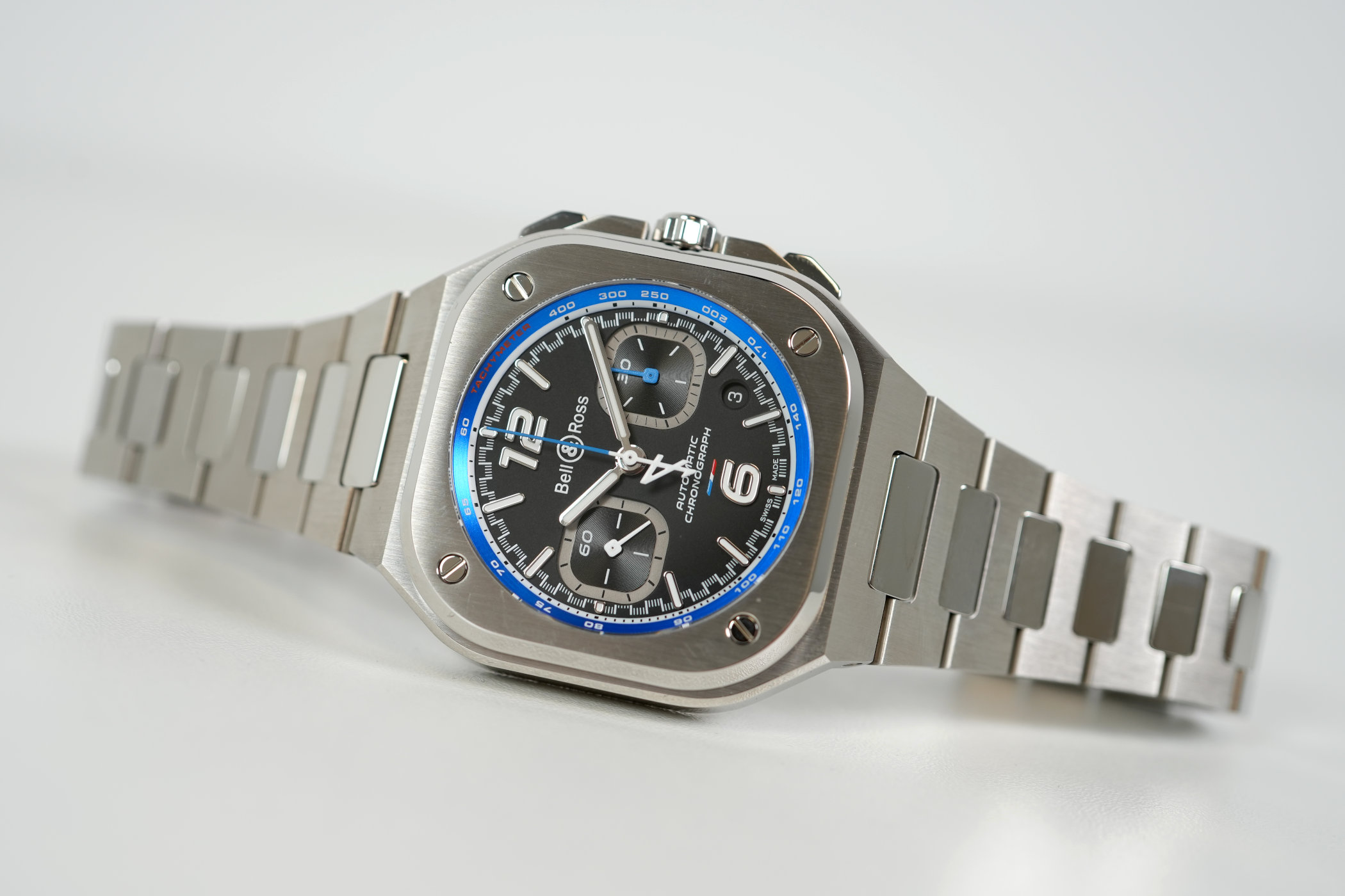 Quick Facts – 42mm x 14.25mm – stainless steel case, brushed & polished – raised steel bezel with functional screws – screw-down crown with guards and pushers – sapphire crystal front & back – 100m water-resistant – matte black dial – sloped tachymeter flange in blue – applied indices & hands with Super-LumiNova – blue chronograph hands – BR-CAl.326 (Sellita SW510 base) – 28,800vph – 60h power reserve – hours, minutes, small seconds, chronograph, date – integrated steel bracelet or black & blue leather strap – limited to 500 pieces – EUR 6,990