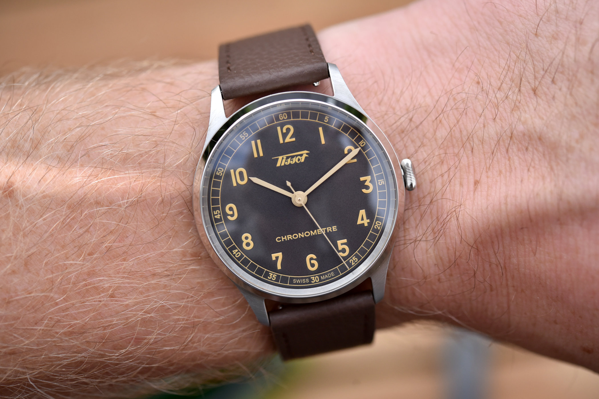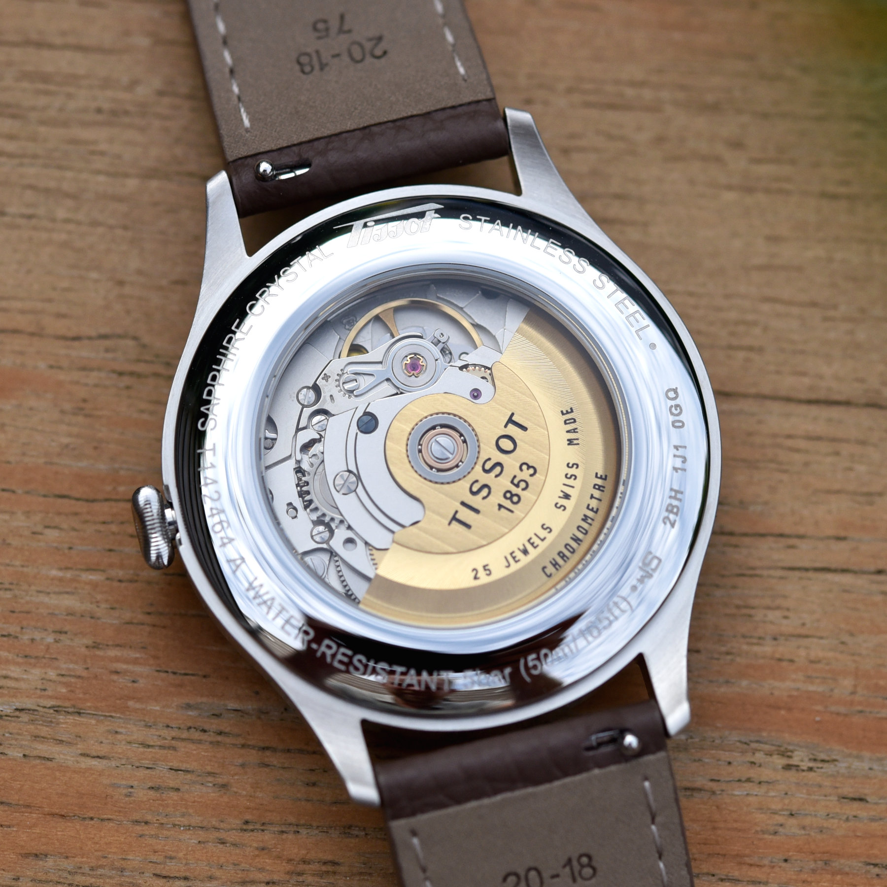 Quick Facts – 39mm x 11mm – stainless steel case, brushed & polished – sapphire crystal front & back – onion-style crown – 50m water-resistant – salmon or anthracite dial – raised numerals with black or beige finish – black or beige hands – vintage Tissot logo – ETA 2824-2, automatic – COSC-certified chronometer – 28,800vph – 38h power reserve – vintage style leather strap in grey or brown – EUR 875