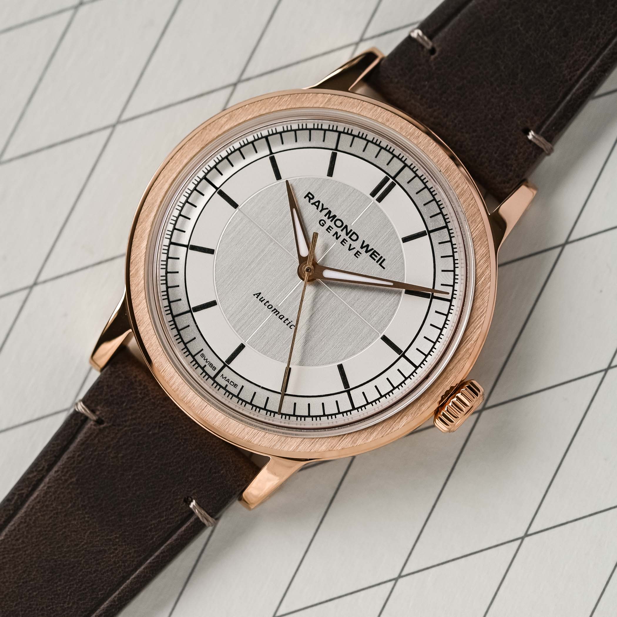 The Millesime by Raymond Weil came out of the blue and caused quite a sensation, not in the least for its elegant good looks. The contemporary take on the vintage sector dial is executed to perfection, with the salmon-coloured Central Seconds model being one of the stand-out pieces in the collection. With a 39,25mm by 9.25mm stainless steel case, it’s also proportioned very well. Factor in the reliability and serviceability of the Sellita SW200-based Calibre RW4200 and the vintage style leather strap and you end with a mighty stylish watch! At EUR 1,625 (or EUR 1,750 in gold PVD) it also doesn’t cost an arm and a leg.