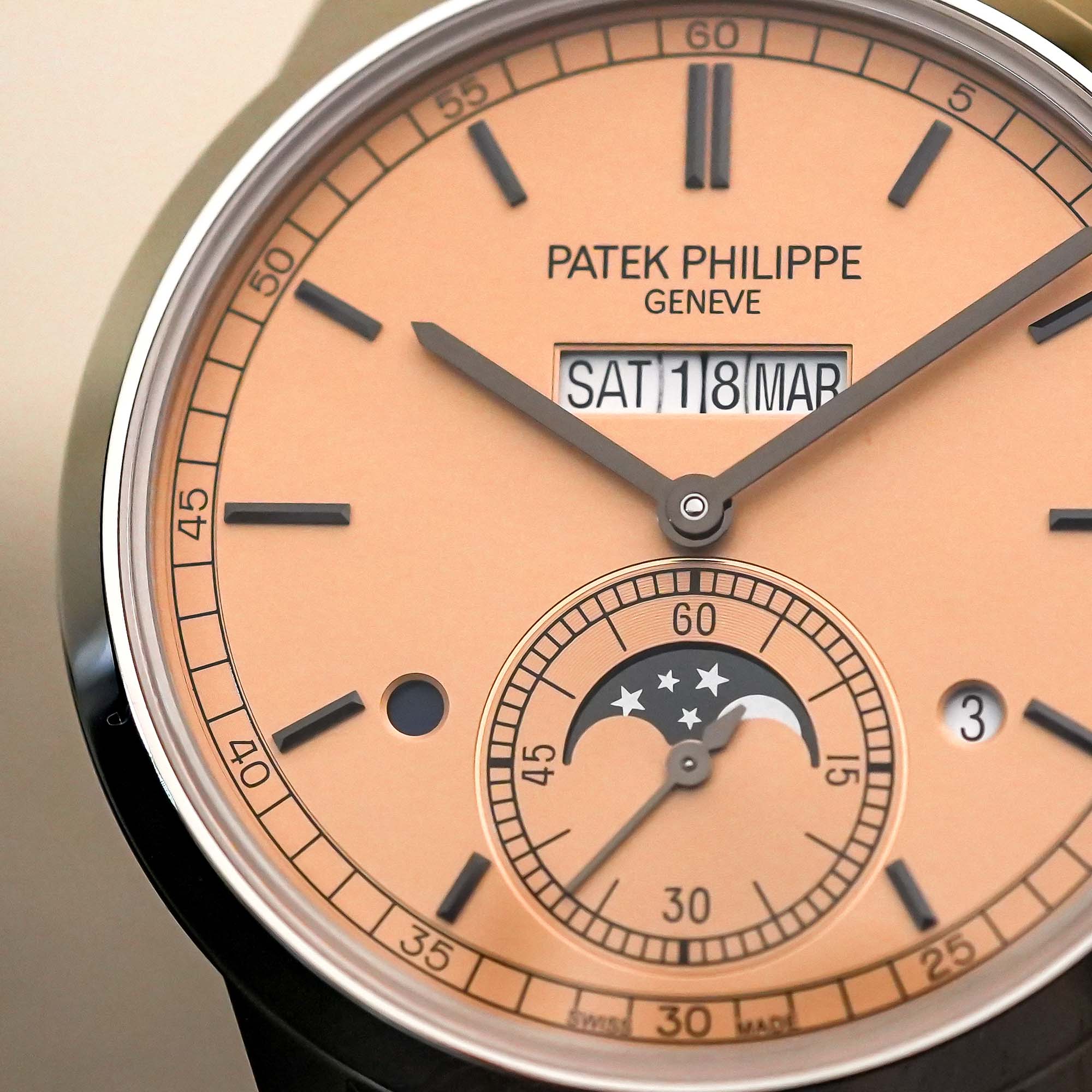 Quick Facts – 41.3mm x 11.07mm – 950 platinum case, polished – sapphire crystal front & back – 30m water-resistant – brass-based opaline rose-gilt dial – charcoal markers & hands – in-line QP display with leap year, day/night and moon phase indicators – small seconds sub-dial – calibre 31-260 PS QL, in-house – Patek Philippe seal – micro-rotor automatic – 28,800vph – 38-48h power reserve – brown alligator leather strap with platinum fold-over clasp – CHF 120,000
