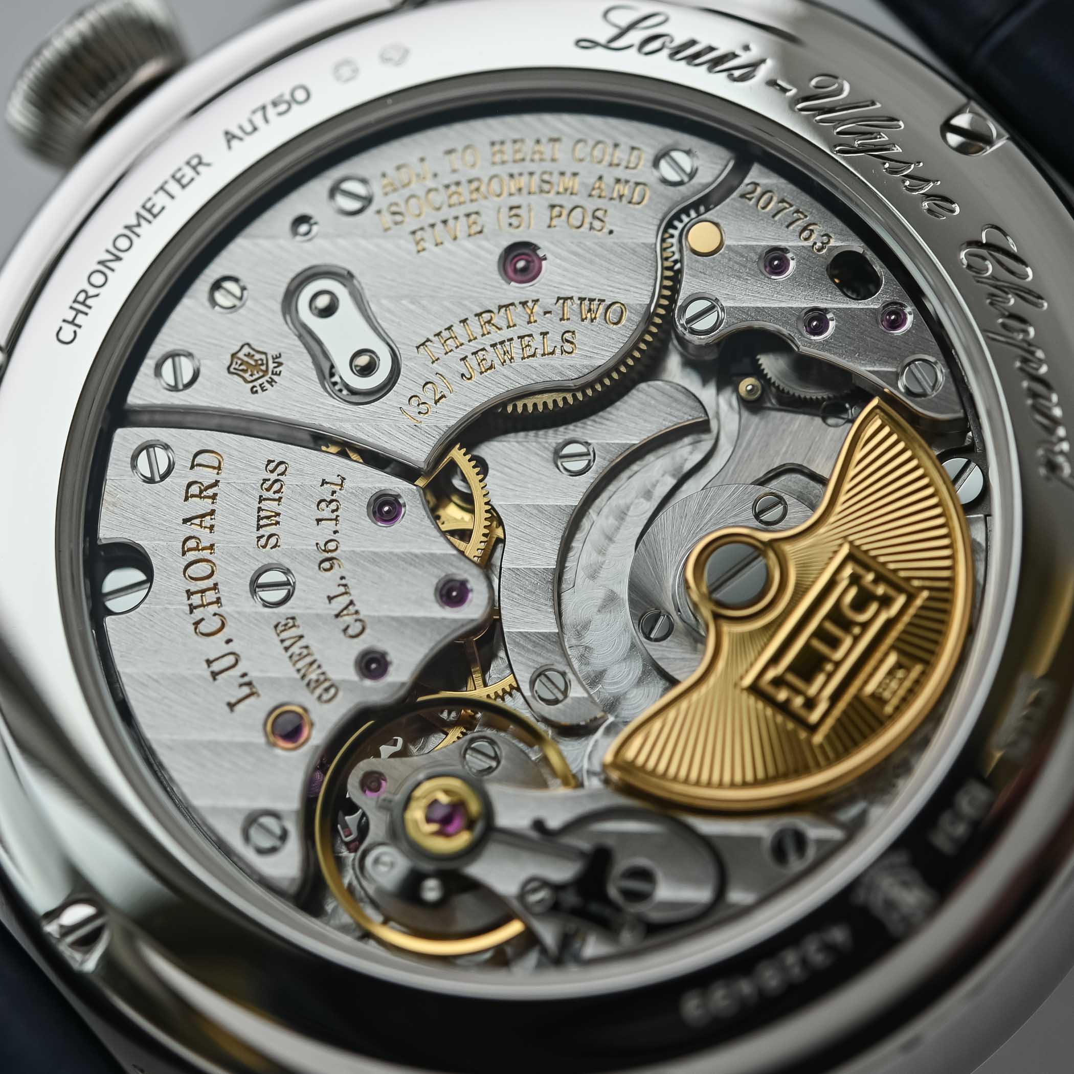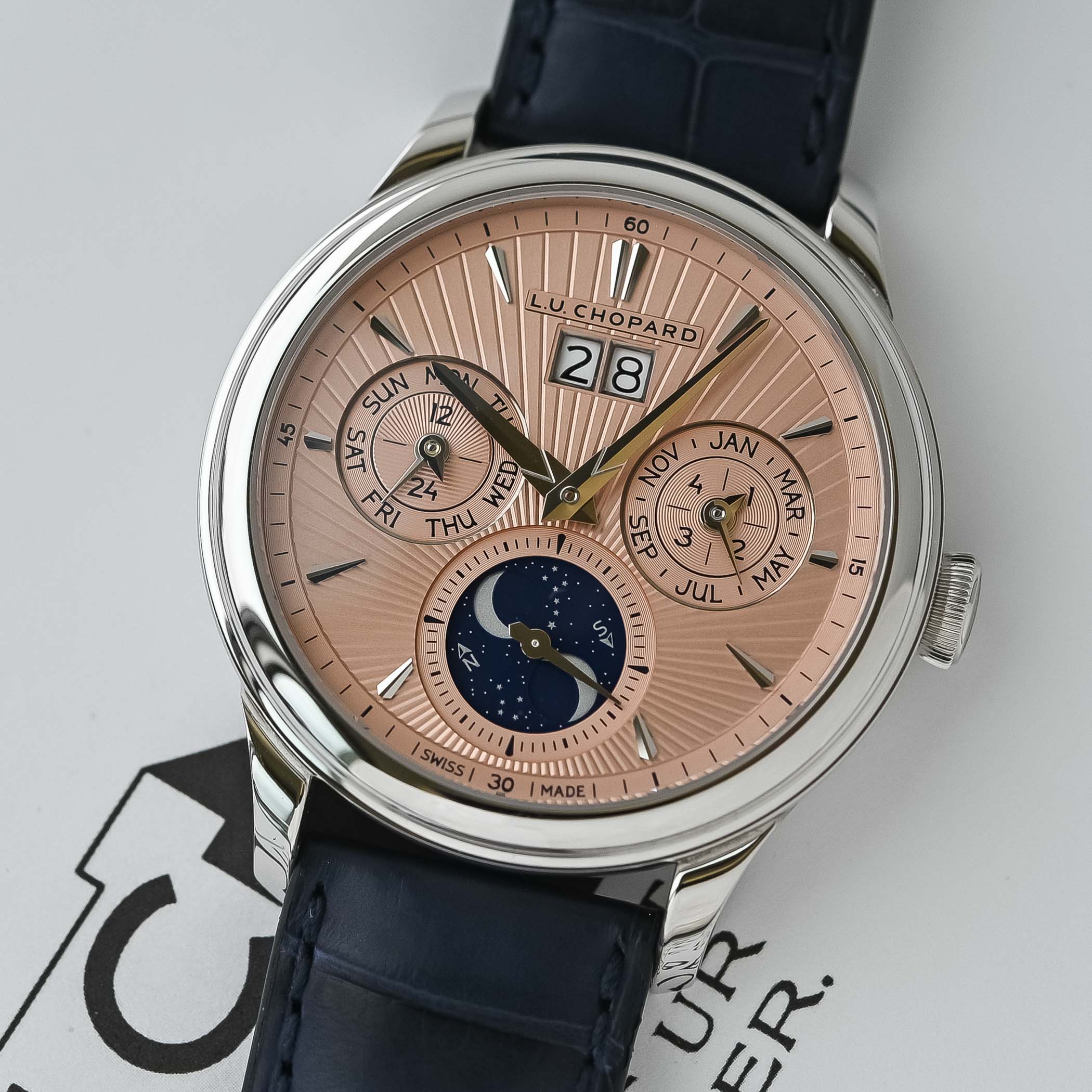 Quick Facts – 40.5mm x 11.63mm – 18k white (or rose) gold case, polished – sapphire crystal front & back – 18k white gold galvanic salmon (or blue) dial, sunburst guilloché finish – central hour & minute hands – perpetual calendar indications with big date & double moon phase display – calibre L.U.C. 96.13L, in-house micro-rotor automatic – 28,800vph – 65h power reserve – blue alligator leather strap with matching gold pin buckle – EUR 92,900