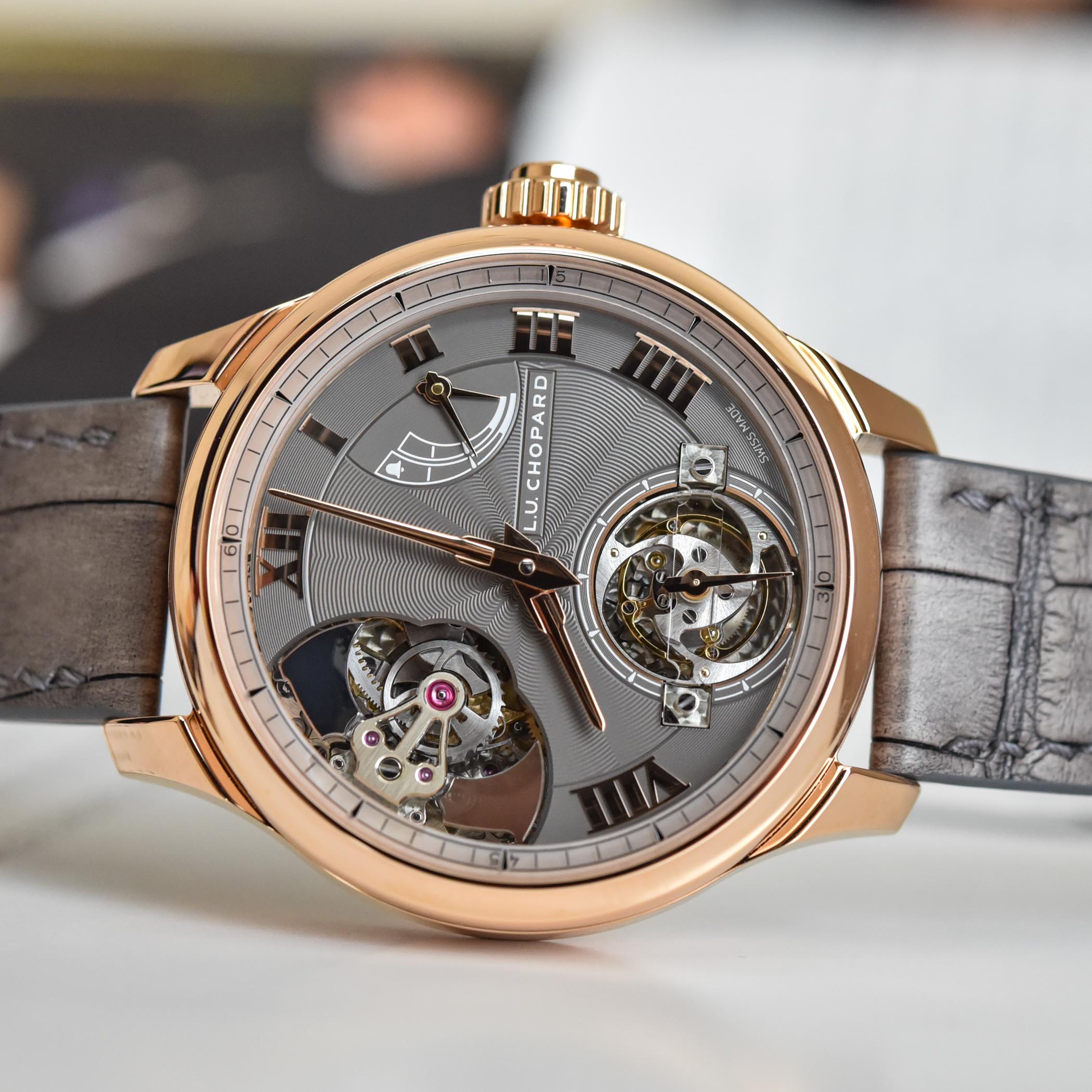 Quick Facts – 42.5mm x 12.58mm – 18k ethical rose gold case and crown – integrated strikework pusher – sapphire crystal front and back – 18k rose gold dial with ruthenium grey finish – hand-applied guilloché pattern – applied Roman numerals – exposed repeater mechanism and tourbillon – Dauphine-fusée hour and minute hands – power reserve and strikework power reserve indication – calibre L.U.C. 08.02-L, in-house – 568 components – 28,800vph – 61 jewels – 50h power reserve – patented monobloc sapphire crystal gongs – hours, minutes, seconds on the tourbillon, stop-seconds and minute repeater, double power reserve indicator – COSC-certified chronometer – Poinçon de Genève quality hallmark – limited to 20 numbered pieces – EUR 377,000