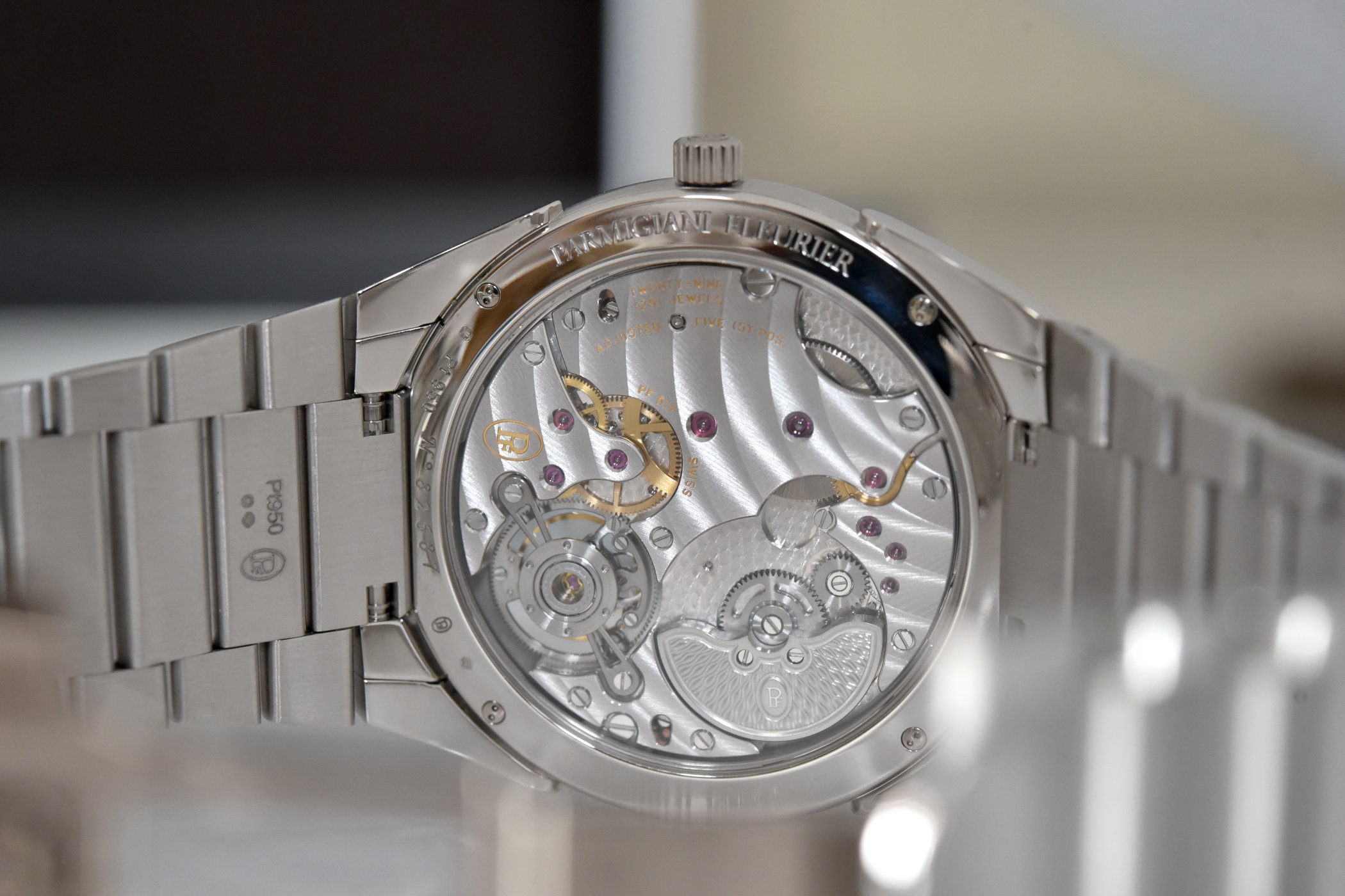 Quick Facts – 41mm x 10.6mm – steel, titanium or pink gold case – sapphire crystals front and back – screw-locked crown – 50m water-resistant – smoked blue GrandeTapisserie dial or sandblasted blue dial (titanium only) – white or pink gold applied indices and hands – calibre 2950, in-house – automatic winding – 270 components – 27 jewels – 21,600vph – 65h power reserve – hours, minutes, one-minute flying tourbillon – steel, titanium or pink gold bracelet – EUR 169,000 (steel), EUR 175,200 (titanium) or EUR 192,400 (gold)