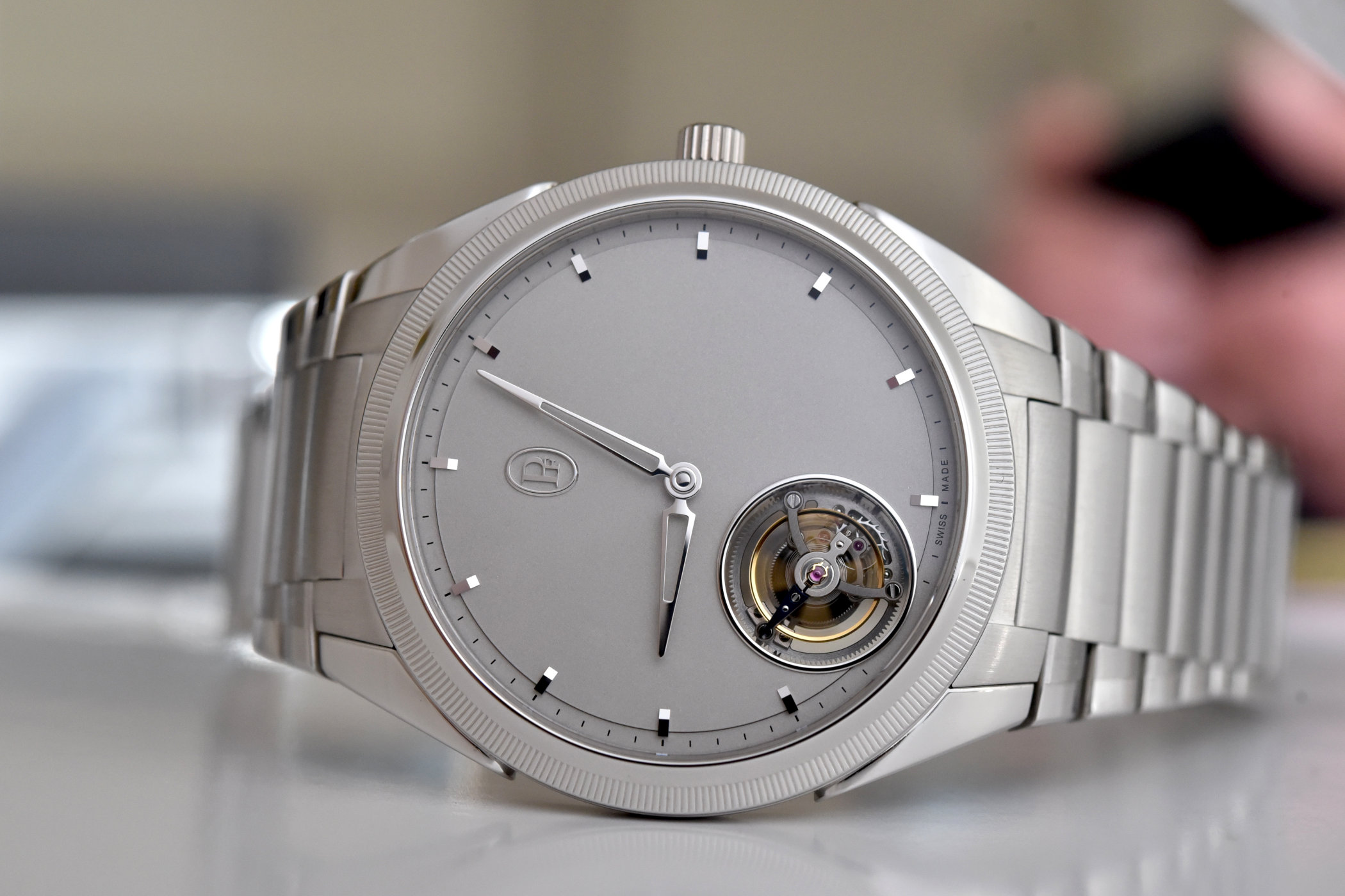 Quick Facts – 42mm x 8.6mm – 950 platinum case – knurled platinum bezel – screw-down crown – sapphire crystal front and back – 100m water-resistant – platinum sandblasted dial – 18k gold ruthenium-plated indices – 18k gold ruthenium-plated hands – flying tourbillon aperture – calibre PF517, in-house – micro-rotor automatic – 207 parts – 29 jewels – 21,600vph – 48h power reserve – hours, minutes, one-minute flying tourbillon escapement – platinum guilloché micro-rotor – platinum bracelet – limited to 25 pieces – CHF 140,000