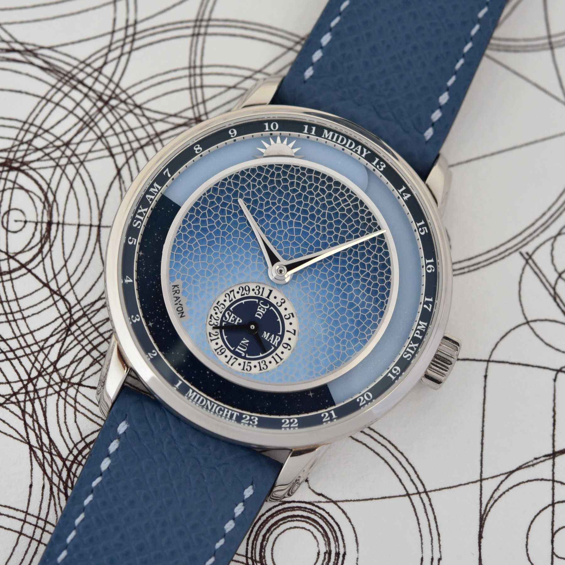 When Krayon first stepped onto the scene of independent watchmaking, it wowed us with the incredible Everywhere. This was followed by the slightly less complex Anywhere, which stayed true to the concept of displaying sunrise and sunset times around the world (although not adjustable through the crown anymore). The Anywhere Métiers d’Art Azur is an artistic expression of the concept, with a drop-dead gorgeous Métiers d’Art miniature enamel painting in various shades of blue on the dial. The central hands indicate the time, combined with a date and month display at the bottom. Around the outer perimeter, the bi-colour rings represent the length of the day, with a travelling sun pointer providing a poetic touch of the time of day. Only 15 of these will be made, at a price of CHF 150,000 excluding taxes.