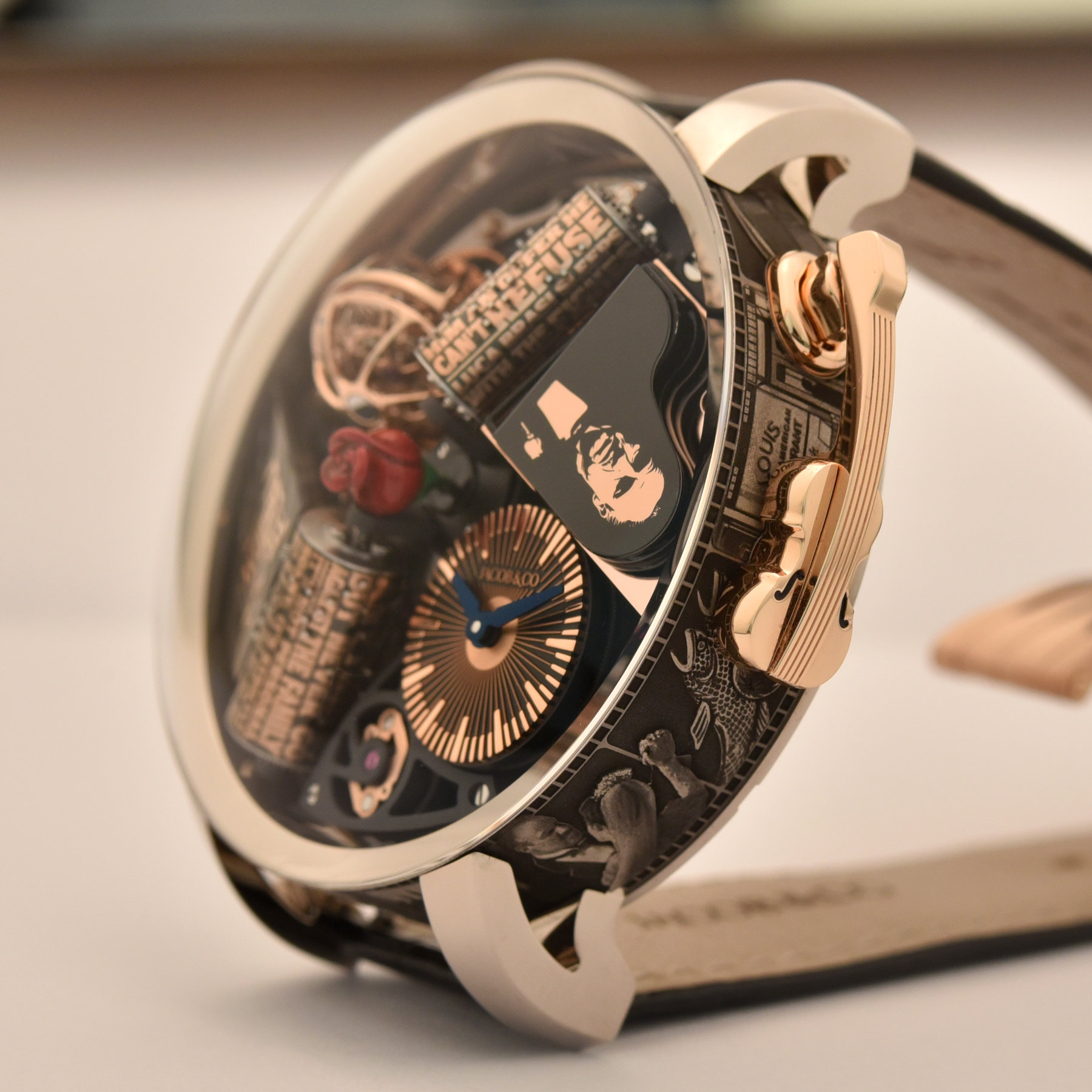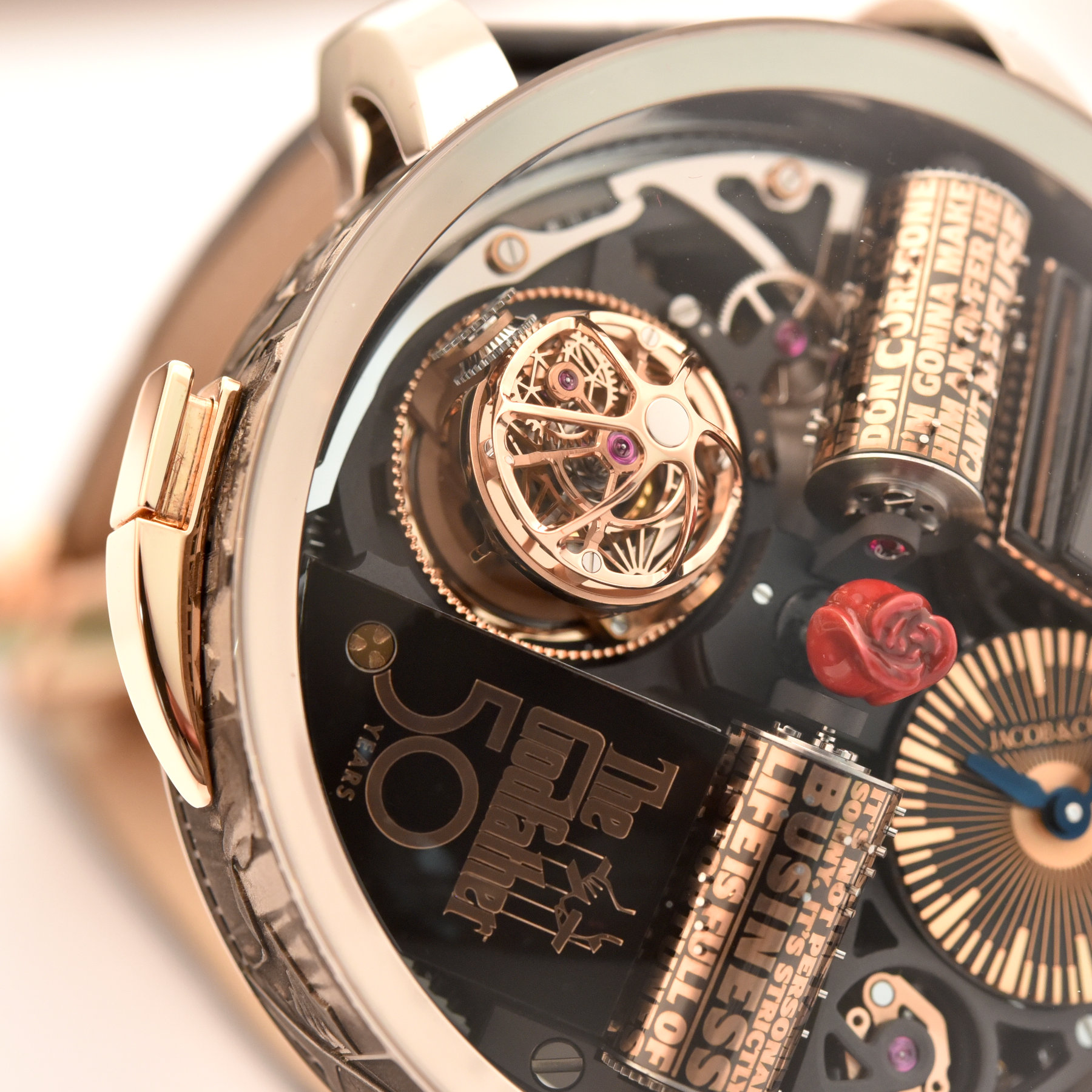 Quick Facts – 49mm x 23mm – white gold case with laser-engraved movie scenes – domed sapphire crystal – caseback with Godfather 50 Years logo – lift-out bow to set and wind the movement – 30m water-resistant – revolving displays – black matte and pink gold applied indices – blued hands – Calibre JCFM04 – 658 components – triple-axis tourbillon – 21,600vph – 42h power reserve – hours, minutes, musical movement with 2 cylinders and combs playing 120 notes – sculpted rose – gloss black piano with Godfather image – alligator strap – limited edition of 50 pieces – USD 500,000