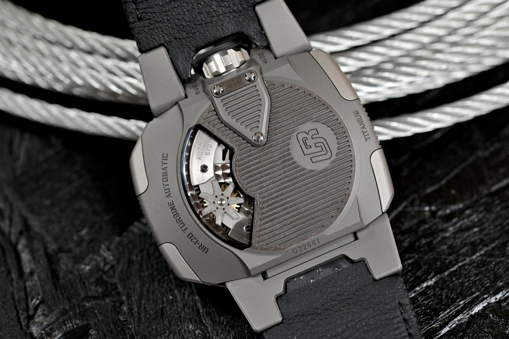 Quick Facts – 47mm x 44mm x 15.8mm – sandblasted titanium and steel case – sapphire crystal front and back – hinged lugs – covered crown – 30m water-resistant – signature satellite display of time – digital hour satellites with splitting cubes on planetary gears – arched analogue minutes track – Calibre UR-20.01 – automatic winding with Windfänger governed rotor – 28,800vph – 32 jewels – 48h power reserve – calf-leather strap with embossed ballistic fibre pattern – limited by production – CHF 100,000 before taxes