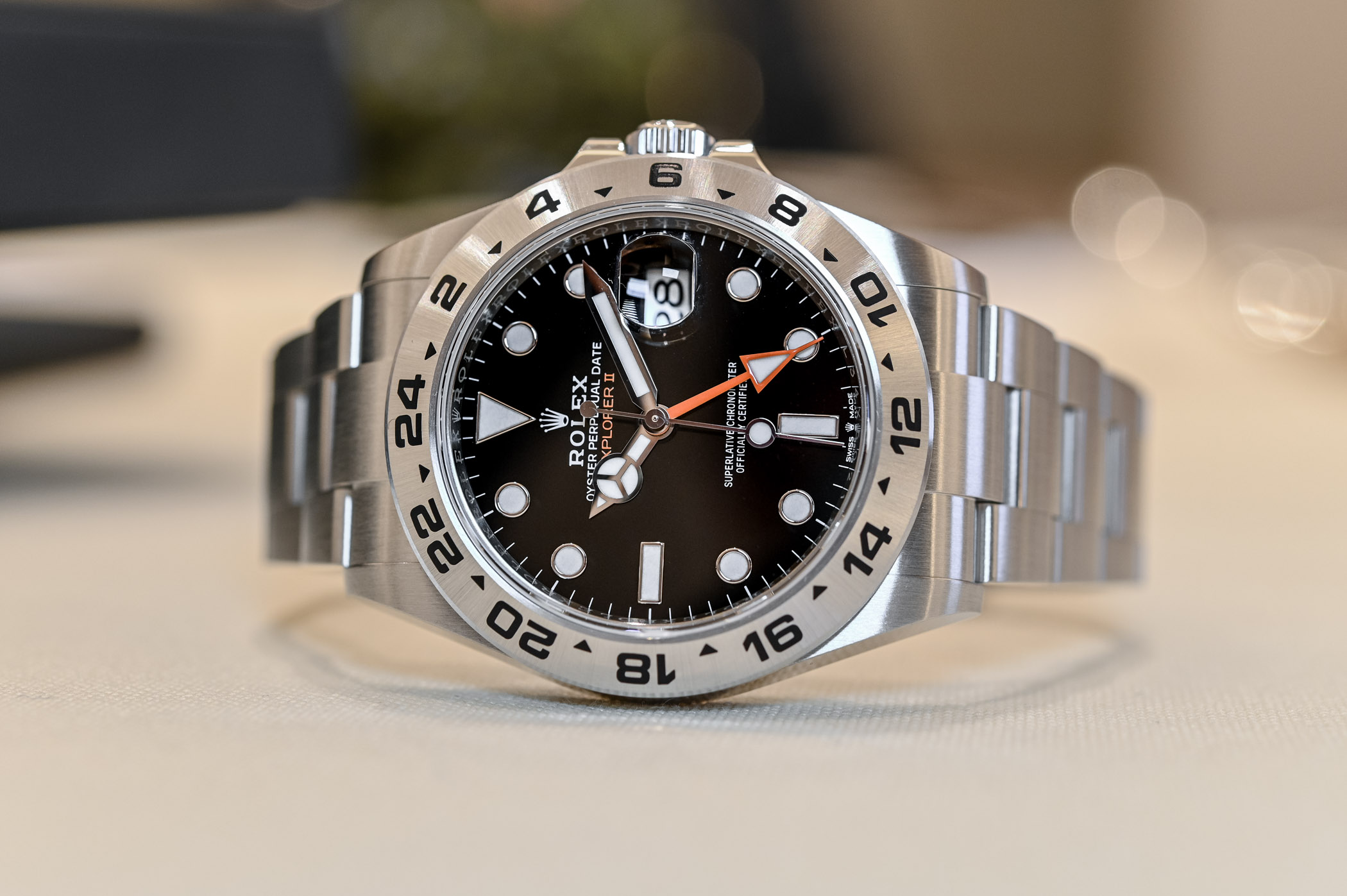 Quick Facts: 42mm x approx 12mm – stainless steel case – fixed engraved 24h bezel – 100m water-resistant – matte black dial with orange accents – calibre 3285, in-house, superlative chronometer, 70h power reserve, local time hand adjusted by one-hour increments – stainless steel Oyster bracelet – M226570-0002 – EUR 8,050