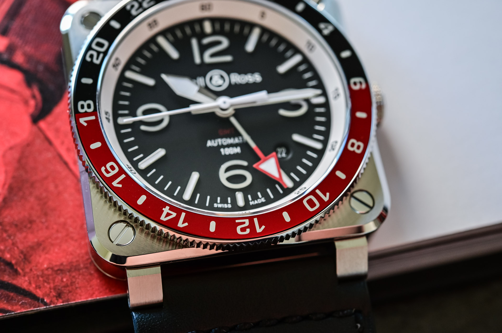 Quick Facts: 42mm x 42mm – stainless steel, bidirectional black and red 24h bezel – 100m water-resistant – Calibre BR-CAL.303, Sellita SW-330 base, 42h power reserve, independent GMT hand – black leather strap – BR0393-BL-ST/SCA – EUR 3,800