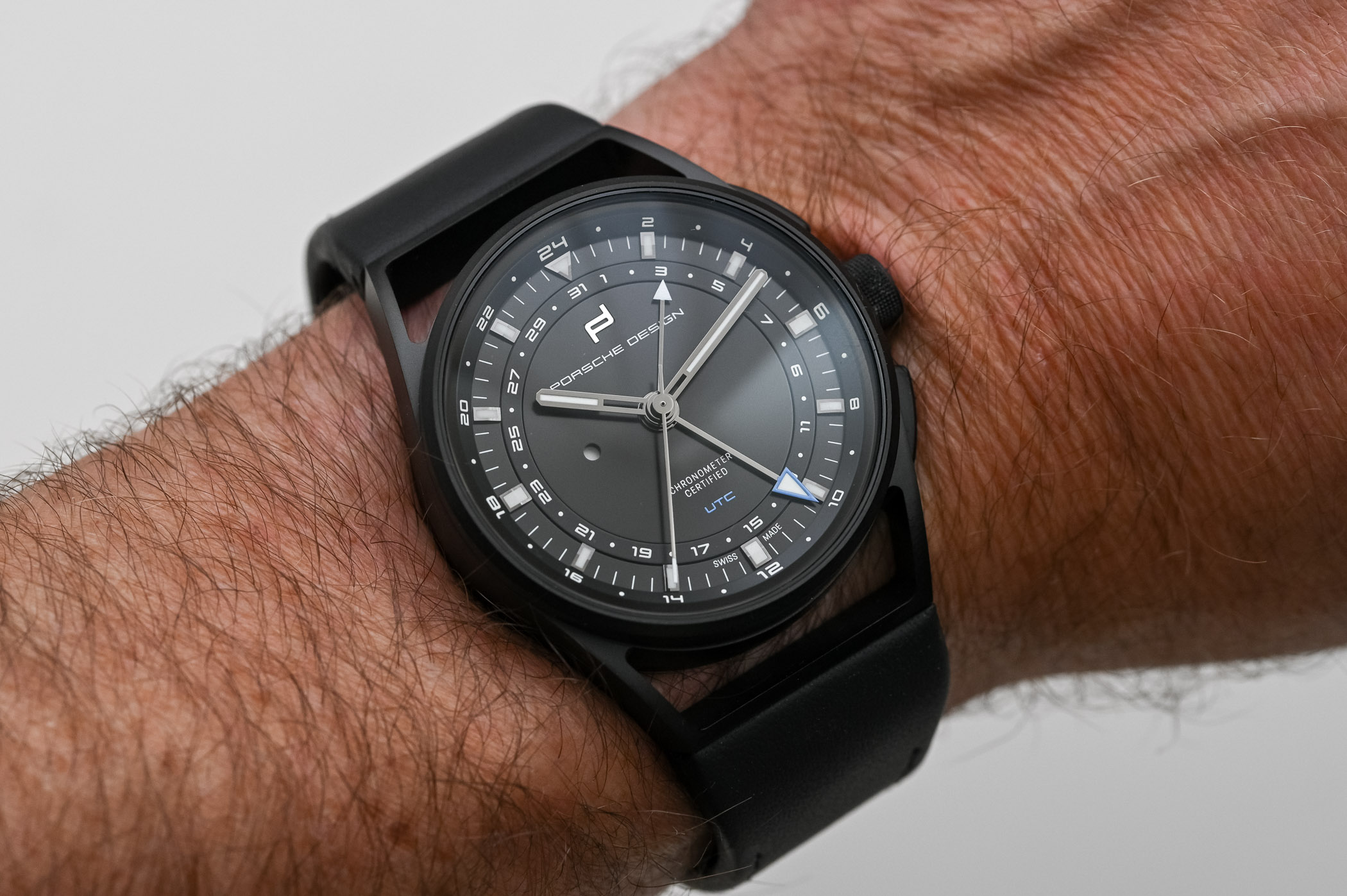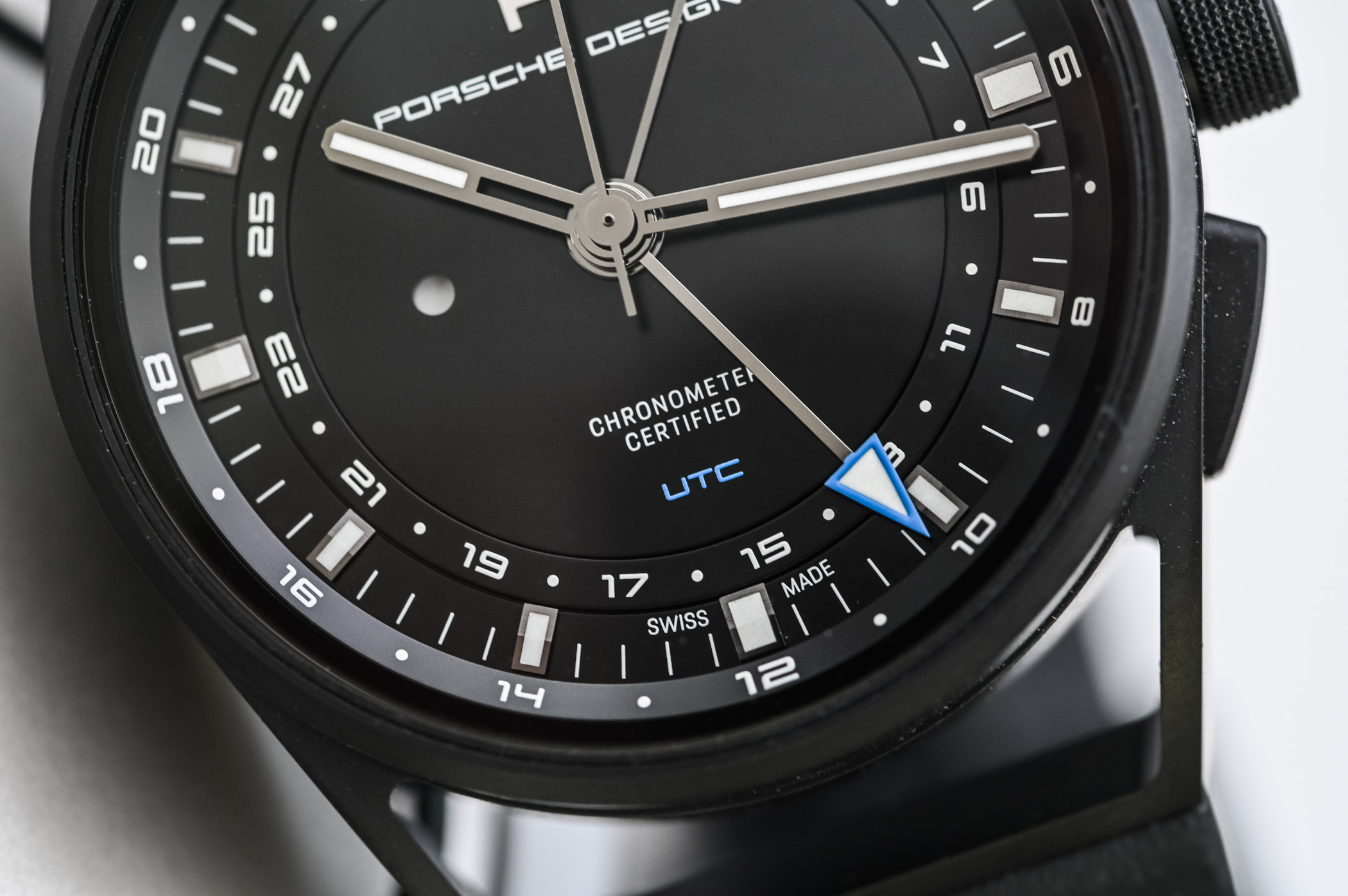 Quick Facts: 42mm x 14.90mm – titanium case glass bead-blasted, with black PVD coating – 100m water-resistant – matte black dial with 24h indication – Porsche Design calibre WERK 04.110 (base Sellita SW 200-1 with proprietary UTC module), COSC certified, 38h power reserve, local time hand adjusted by “+” and “-” pushers – Porsche vehicle leather strap – 4056487005355 – EUR 6,250