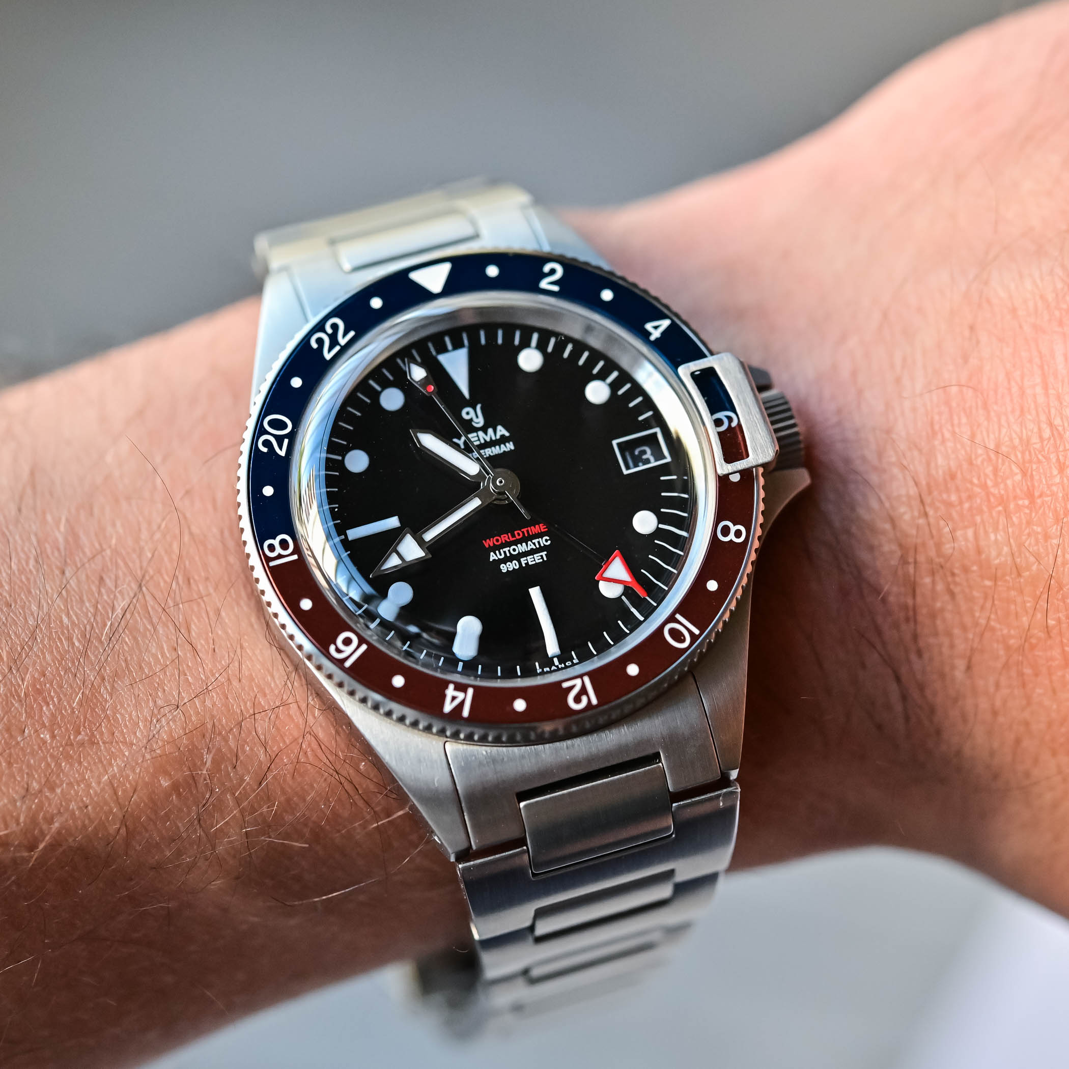 Quick Facts: 39.5mm – stainless steel case – bidirectional bezel with blue/red 24h insert – 300m water-resistant – glossy black dial with red accents – YEMA3000 manufacture calibre, 42h power reserve, independent 24h GMT hand – stainless steel bracelet – EUR 1,190