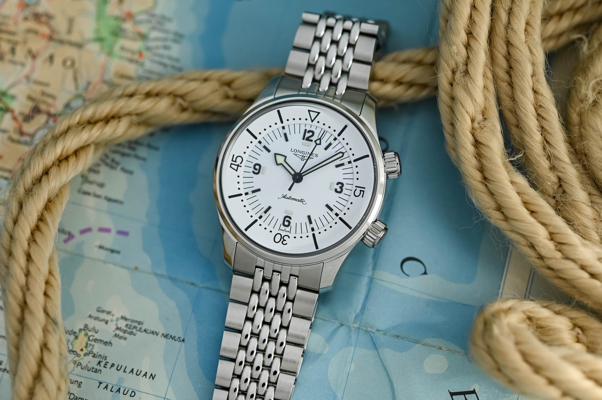 Quick Facts – 39mm x 12.7mm – stainless steel case, brushed & polished – screw-down crown – secondary crown for internal rotating bezel – sapphire crystal – solid caseback – 300m water-resistant – matte white dial – black numerals, markers & hands with SLN – sloped rotating inner bezel – calibre L888.6, automatic – 25,200vph – 72h power reserve – stainless steel beads-of-rice bracelet with folding clasp – permanent collection – EUR 3,750.