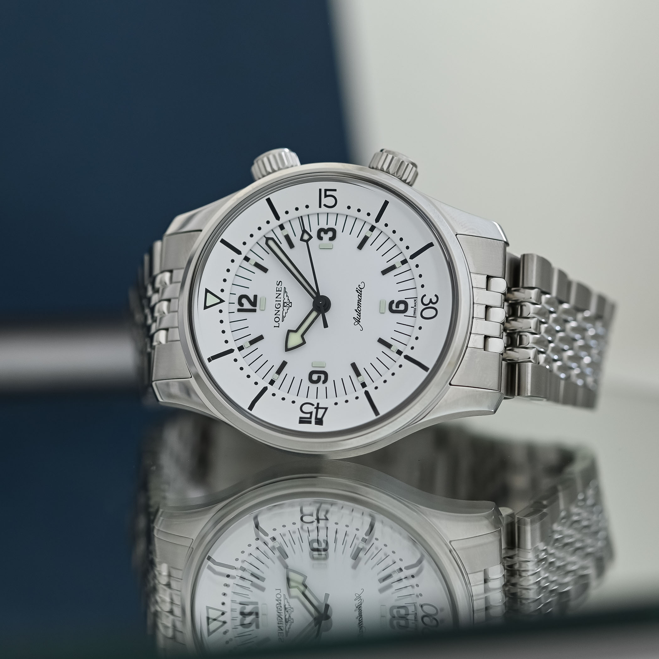 Quick Facts – 39mm x 12.7mm – stainless steel case, brushed & polished – screw-down crown – secondary crown for internal rotating bezel – sapphire crystal – solid caseback – 300m water-resistant – matte white dial – black numerals, markers & hands with SLN – sloped rotating inner bezel – calibre L888.6, automatic – 25,200vph – 72h power reserve – stainless steel beads-of-rice bracelet with folding clasp – permanent collection – EUR 3,750.