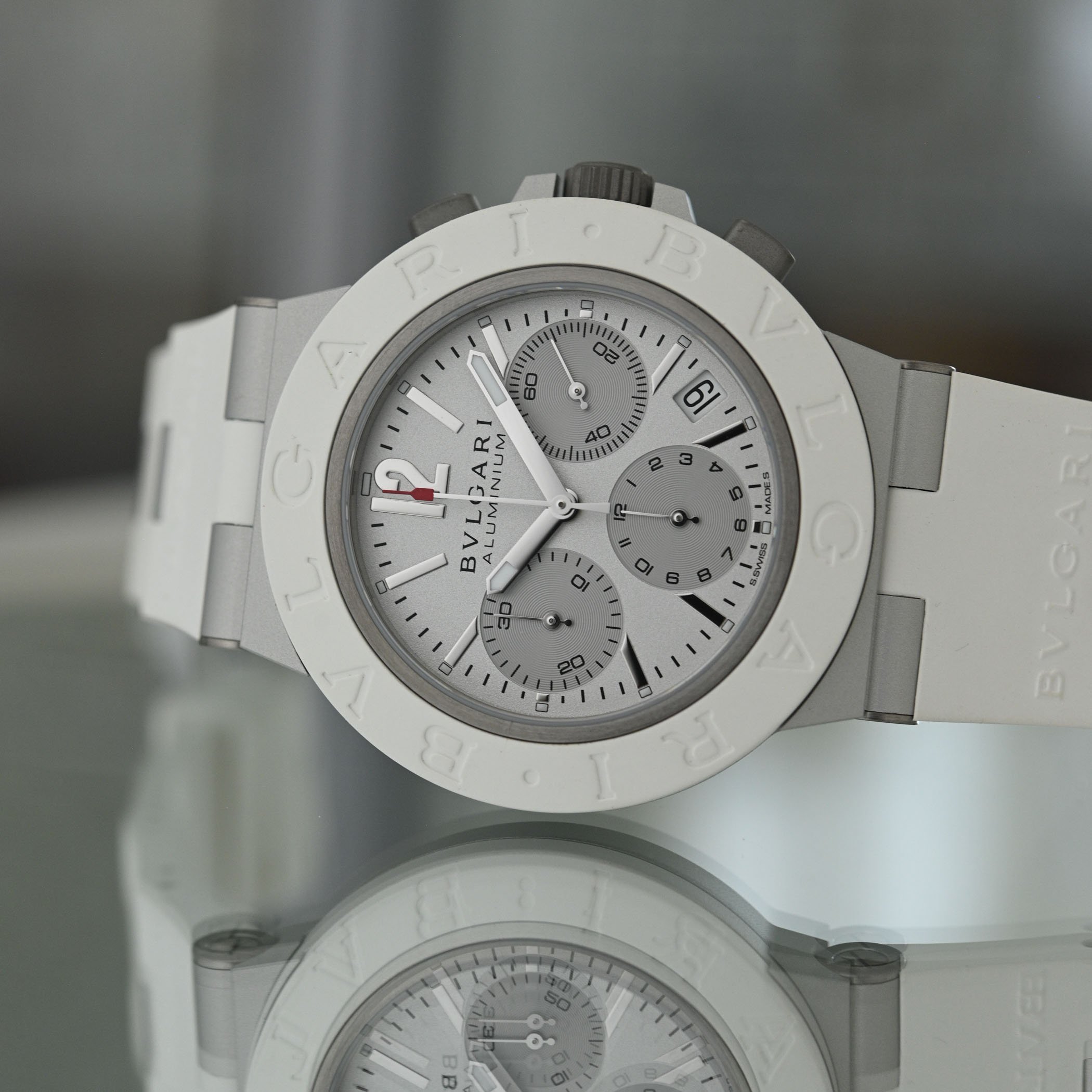 Bulgari aluminium chronograph white – actually looks pretty nice. Would never buy it but they did a good job on the design. The two tone on it really makes it look smart.