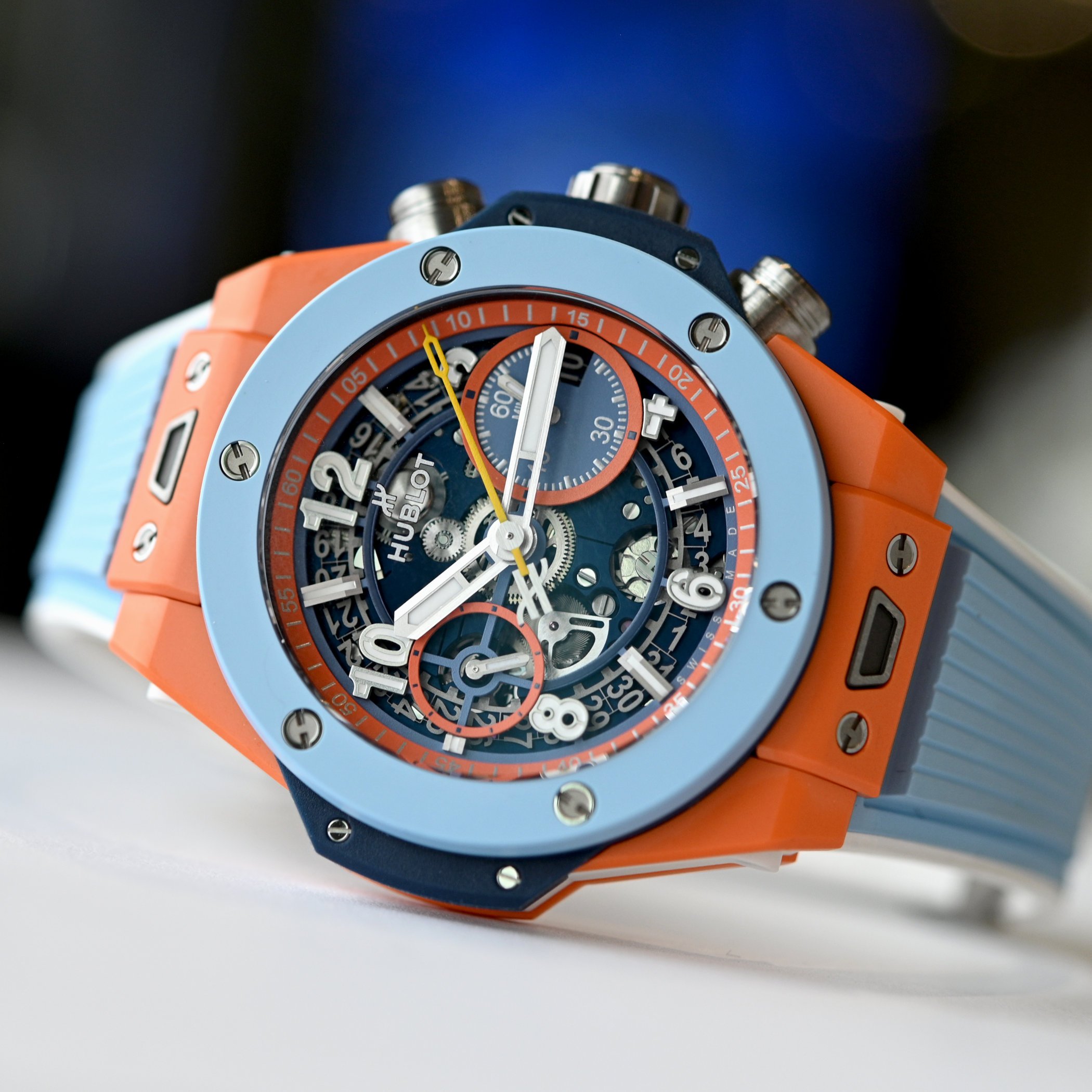Quick Facts – 42mm x 14.5mm – multi-colour ceramic case – sky-blue ceramic bezel – sapphire crystal front & back – titanium crown & pushers – 100m water-resistant – openworked dial with dark blue finish – luminous markers & hands – HUB1280 Unico, in-house – automatic flyback chronograph with column wheel – 28,800vph – 72h power reserve – hours, minutes, small seconds, flyback chrono, date – three rubber straps with titanium deployant clasp – 100 pieces – EUR 32,600