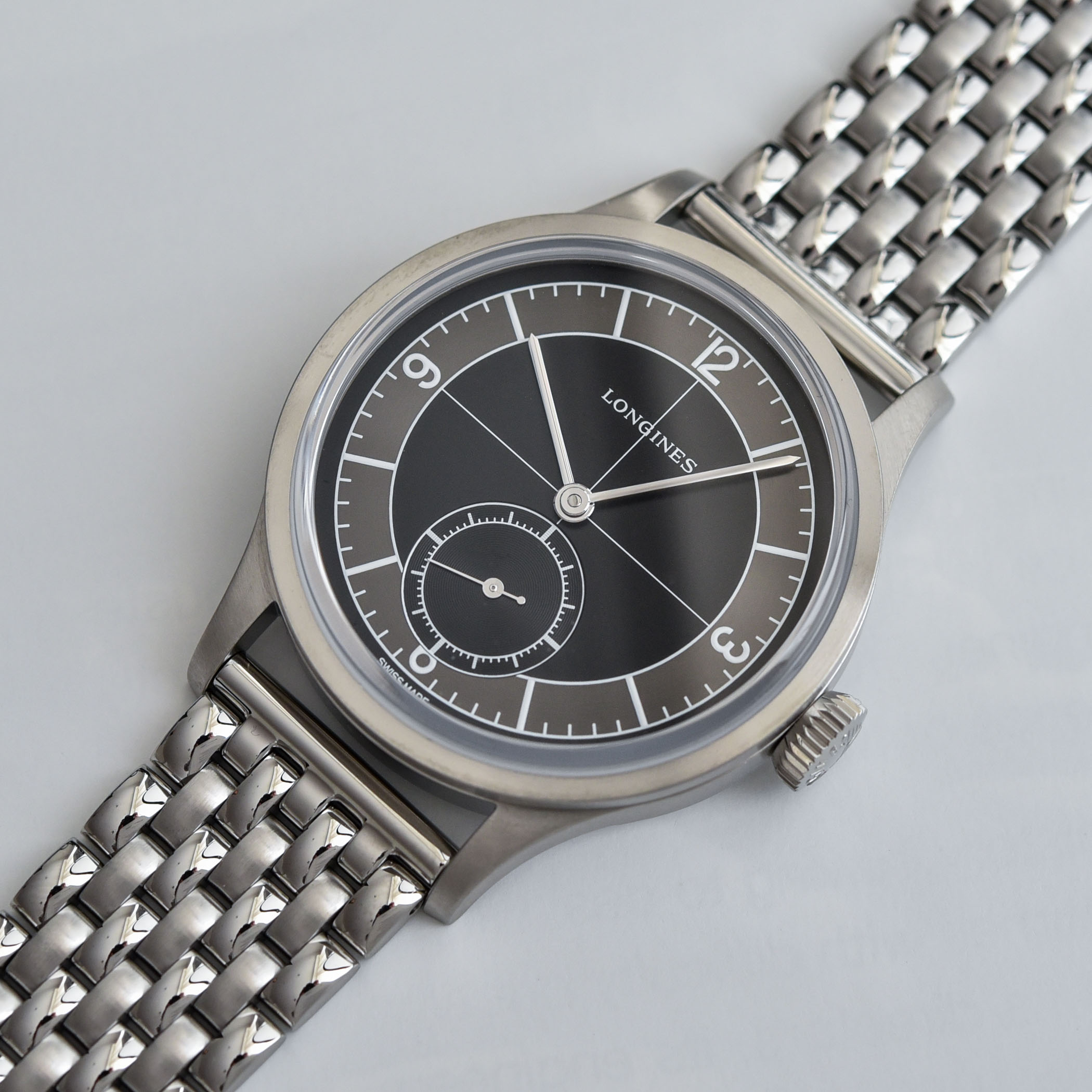 Quick facts: 38.5mm x 11.5mm – stainless steel case, stepped bezel, brushed with polished accents – 30m water-resistant – two-tone sector dial in black and charcoal grey, polished silvered hands – calibre L893 (base ETA A31.501) – automatic, 3.5Hz, 72h power reserve – beads-of-rice stainless steel bracelet or cognac-coloured leather strap – reference L2.828.4.53.2 on leather strap and L2.828.4.53.6 on steel BoR bracelet – from EUR 1,920