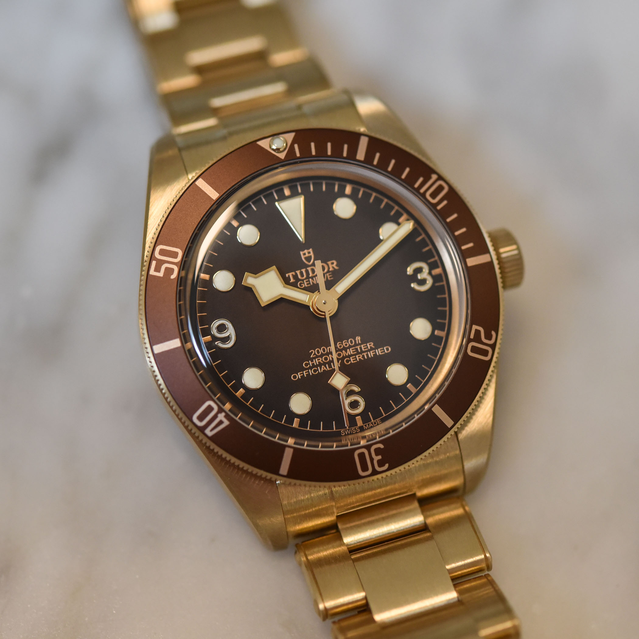 Quick Facts: 39mm x 11.9mm – bronze case, brushed – unidirectional bronze rotating bezel – matte-brown anodised bezel insert – screw-down crown – 200m water-resistance – gradient brown-bronze domed dial – gold-coloured applied indices – hands and indices filled with Super-LumiNova – MT5400 manufacture movement – automatic winding – 28,800vph – 70h power reserve – solid bronze bracelet with micro-adjustment clasp – non-limited edition available in Tudor boutiques only – EUR 4,250