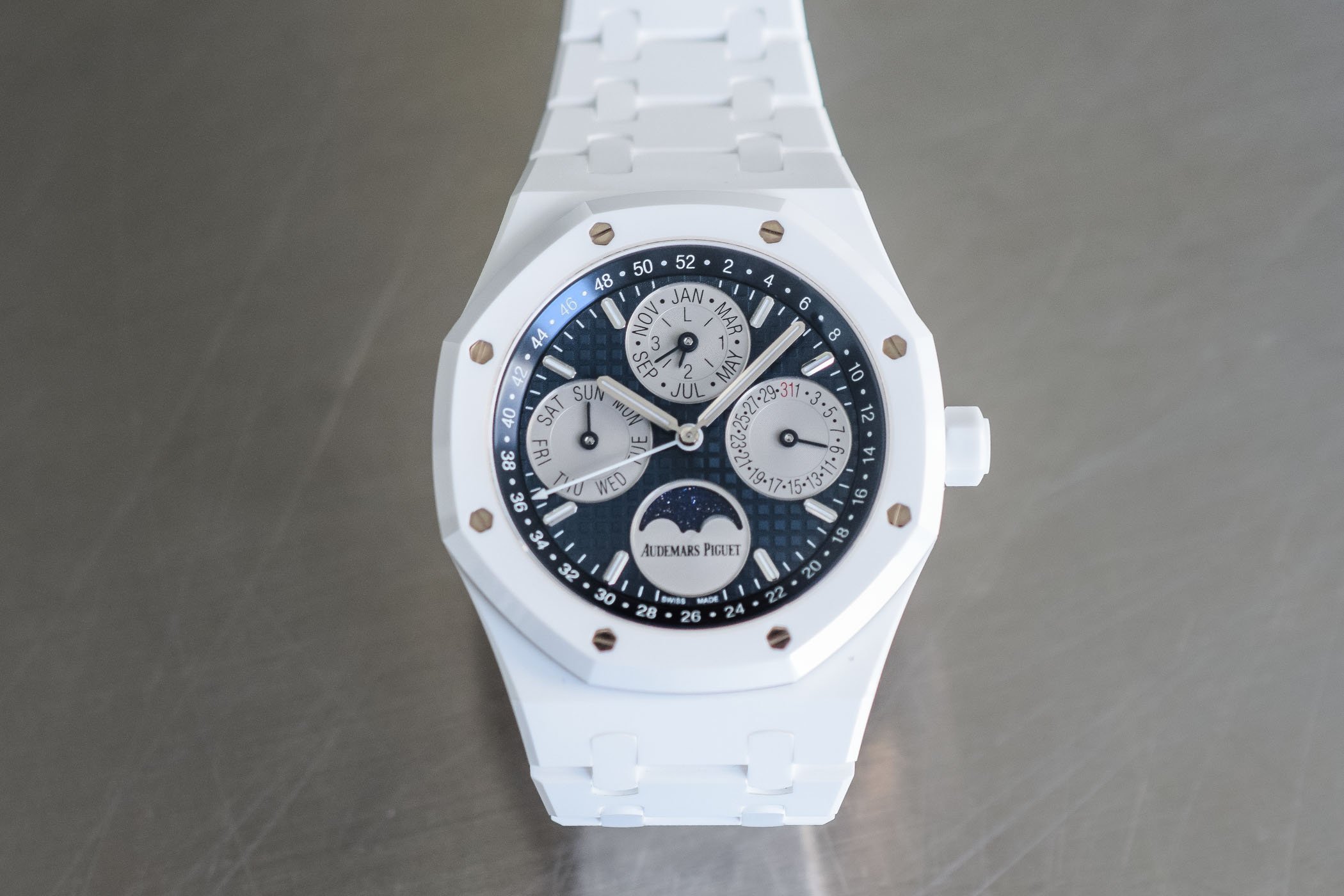 Last but not least, let’s talk serious watchmaking, with the complicated, superbly executed, bold-looking and rare Royal Oak Perpetual Calendar watches in ceramic – all three models currently in production. This concerns the Perpetual Calendar Black Ceramic reference 26579CE.OO.1225CE.01, the Perpetual Calendar White Ceramic reference 26579CB.OO.1225CB.01 and the recently presented Perpetual Calendar Openworked Black Ceramic reference 26585CE.OO.1225CE.01.