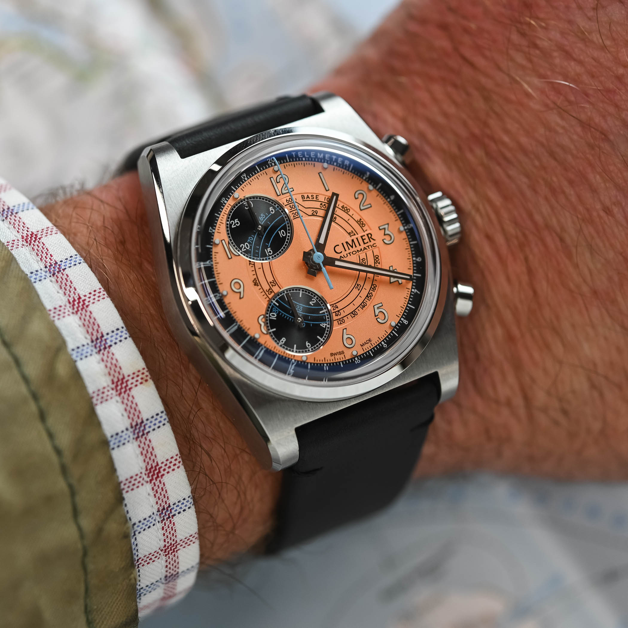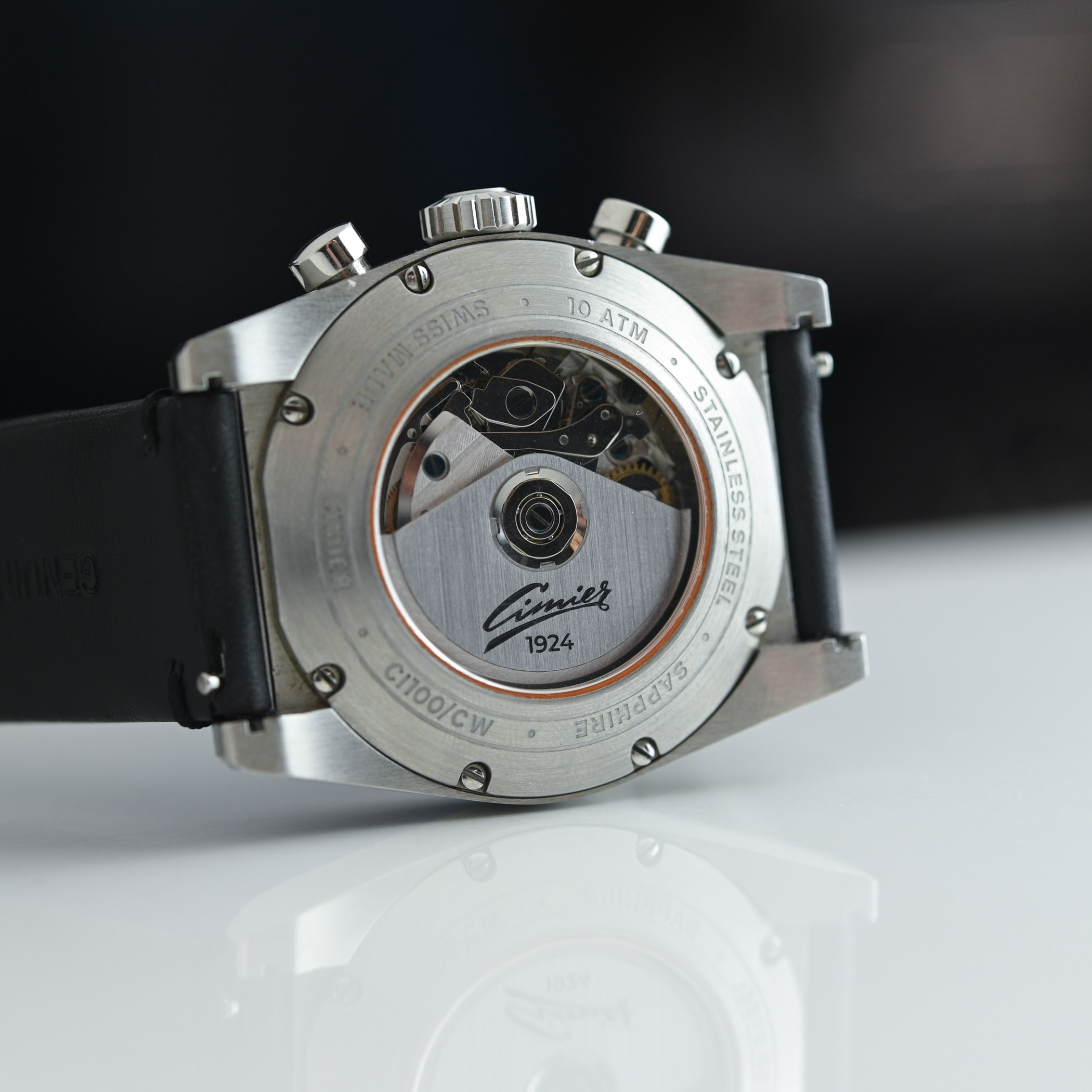 Another blast from the past with an unconventional look is the Cimier 711 Heritage Chronograph Pop collection. This finds its inspiration in the 1960s but is livened up by a pop of colour on the dial. With black sub-dials at 7 and 11, you can guess where it gets its name. You can choose between Tangerine, Pink, Aqua Blue and Lime Green dials, all backed by the Valjoux 7750-based calibre CIM1000. It comes on a flat-link or mesh steel bracelet or a black leather strap. The punchy 39.5mm by 14.45mm Cimier 711, to put it short, costs CHF 2,480 on leather or CHF 2,525 on either of the two bracelets. If these colours are a bit much, you can also opt for Panda or Reverse Panda dials.