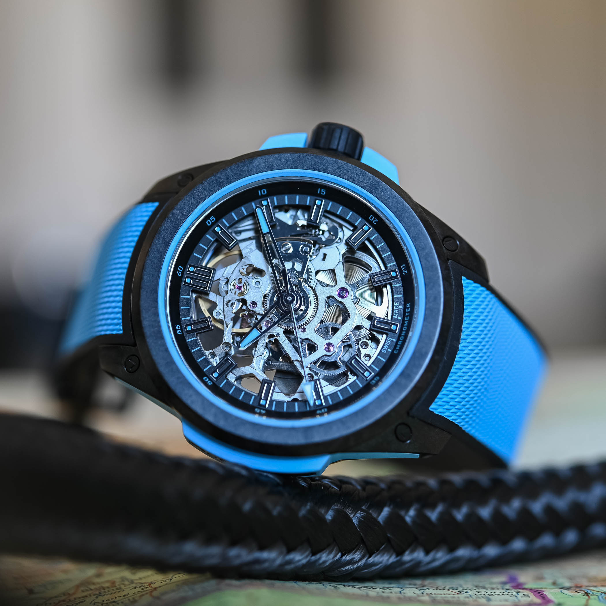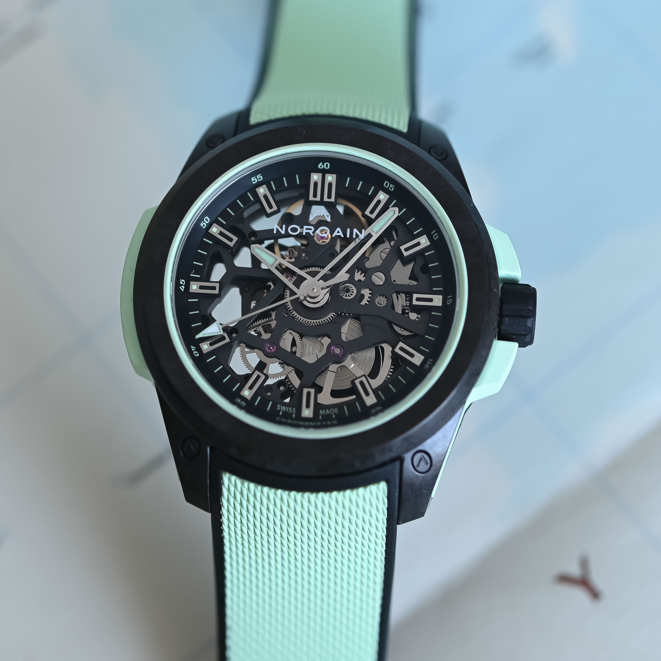 Quick Facts – 39mm x 11.75mm – Norteq carbon composite case – Hyper Pink, Sky Blue, Mint (limited) & Purple Ice Blue rubber shock absorbers – sapphire crystal front & back – screw-down crown – 200m water-resistant – openworked dial – luminous markers & hands – calibre N086, automatic (Sellita) – skeleton construction – 28,800vph – 41h power reserve – colour-matching mesh rubber strap with pin-buckle – EUR 5,390 or EUR 5,490 (Mint Green, 400 pieces)
