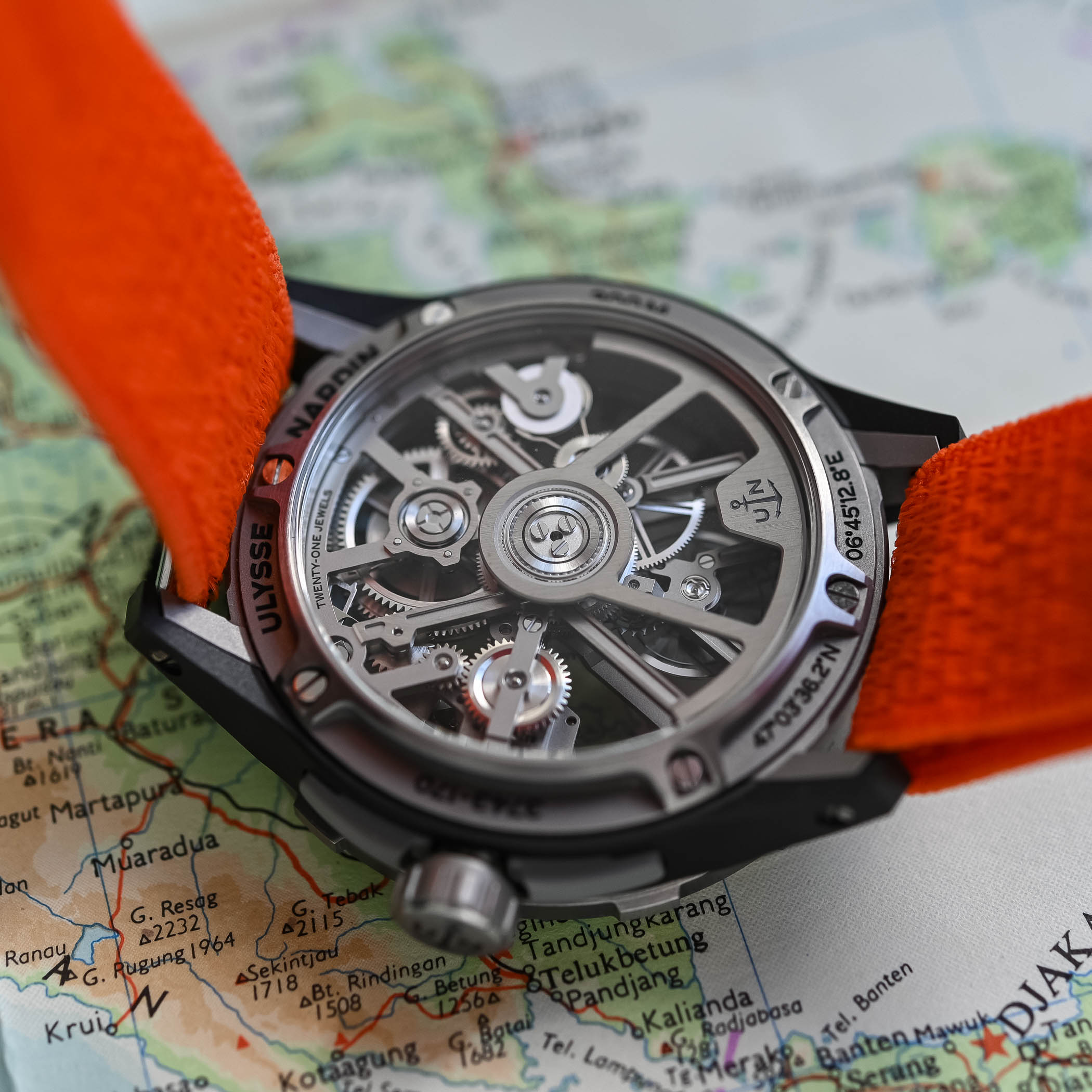 Quick Facts – 44mm x 14.7mm – titanium, Nylo-Foil & carbon fibre case – 52 grams, including strap – sapphire crystal front & back – unidirectional rotating bezel – 200m water-resistant – openworked dial – luminous markers & hands – calibre UN-374, in-house automatic – skeletonised construction – 21,600vph – 90h power reserve – supplied with two straps, orange or white elastic textile strap with scratch-closing – EUR 38,400 (incl. VAT)