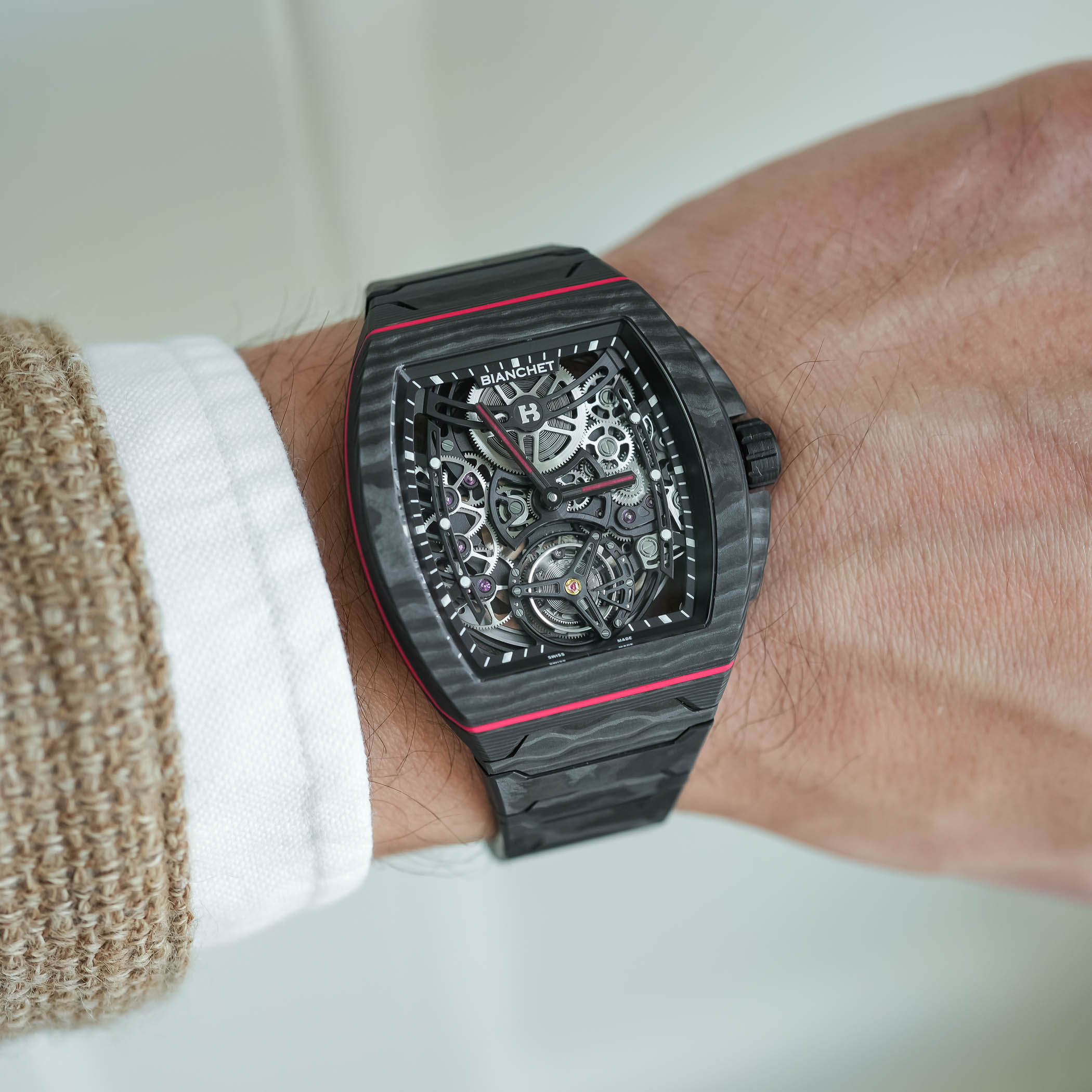 Last on the list is Bianchet’s B1.618 Ultrafino Carbon. Pretty much as it says on the tin, the B1.618 Ultrafin Carbon is a full-carbon-fibre watch, with an impressively light weight and ultra-comfortable construction. The tonneau-shaped case, with a signature coloured gasket, is fitted to a carbon fibre integrated bracelet and houses an automatic skeleton one-minute flying tourbillon movement that will keep running for 60 hours when fully wound. A pair of guards protect the crown, all in carbon fibre as well, and the watch is shock-resistant to 5,000G. With the carbon bracelet, it weighs just 62 grams, and on rubber, it drops to 52 grams! The price is CHF 65.500 excl. VAT.