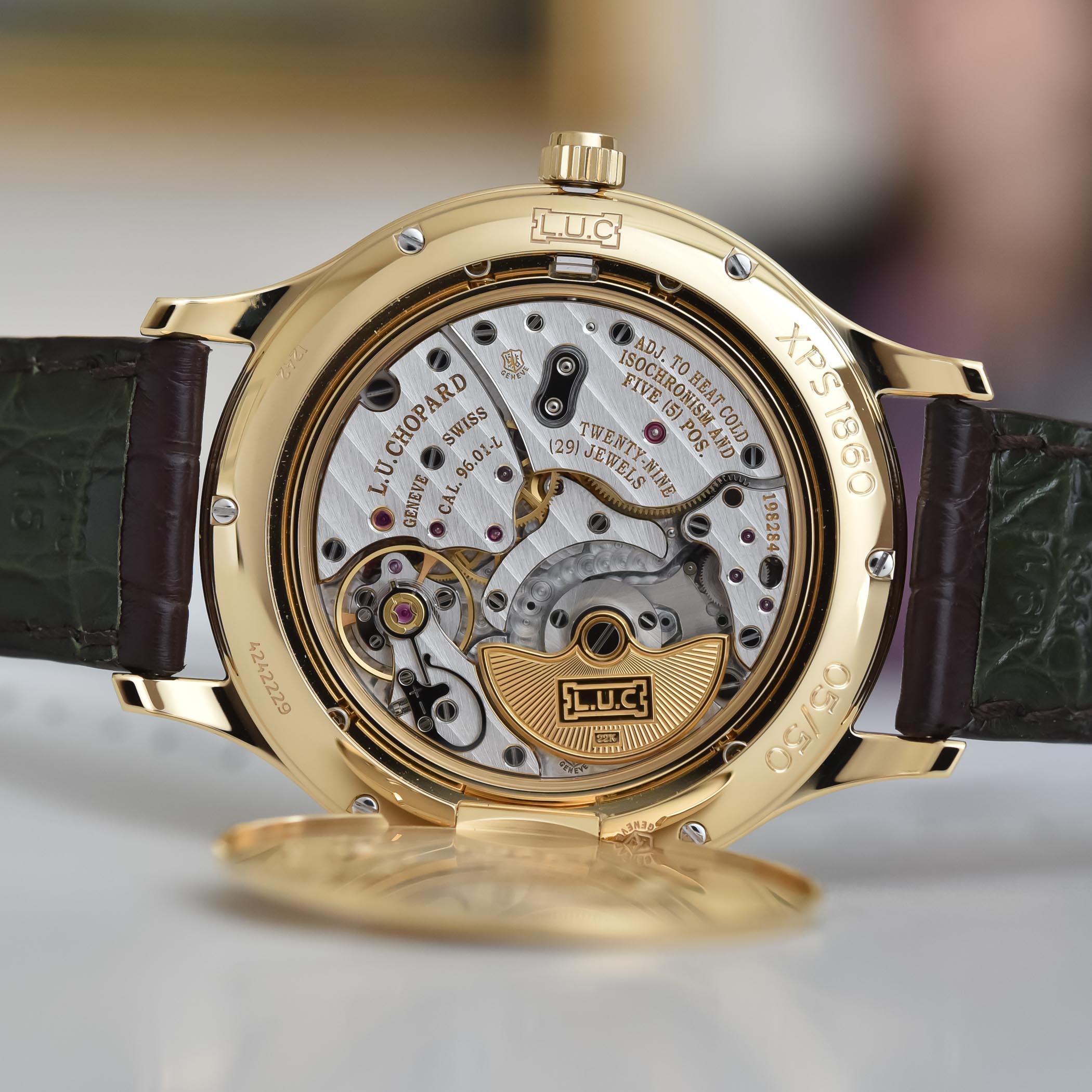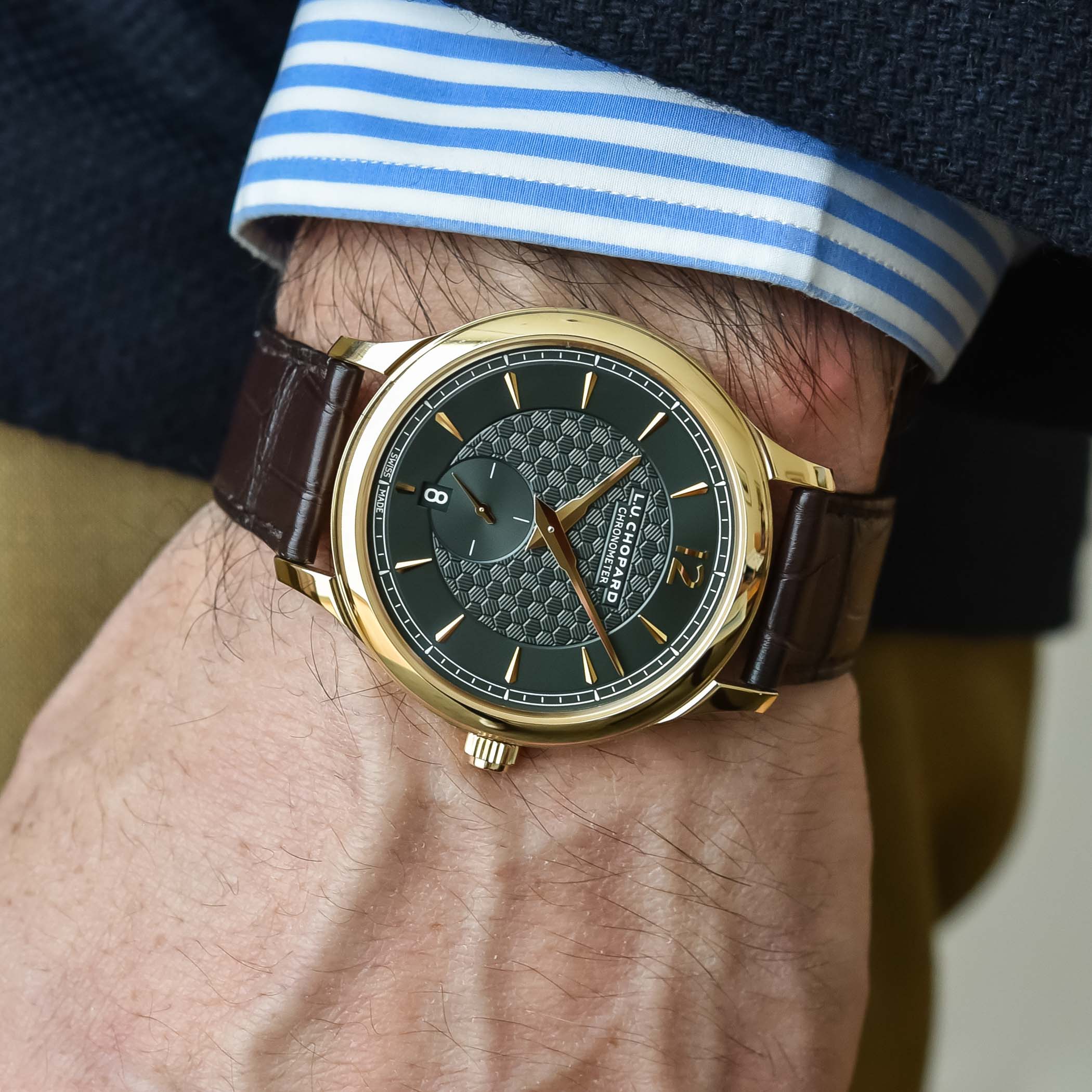 Quick facts: 40mm x 7.20mm – 18k yellow gold case, officer’s case back – self-winding L.U C 96.01-L mechanical movement – brown alligator leather strap on pin buckle – numbered limited edition of 50 pieces – CHF 33,500