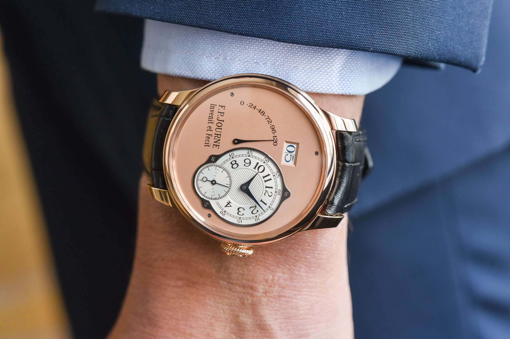 Quick facts: 40mm or 42mm x 10.7mm – 18k rose gold case – automatic F.P. Journe calibre 1300.3 in 18k rose gold, off-centre hours, minutes, small seconds, power reserve indicator on 120 hours, large date – alligator leather strap on pin buckle – CHF 42,500
