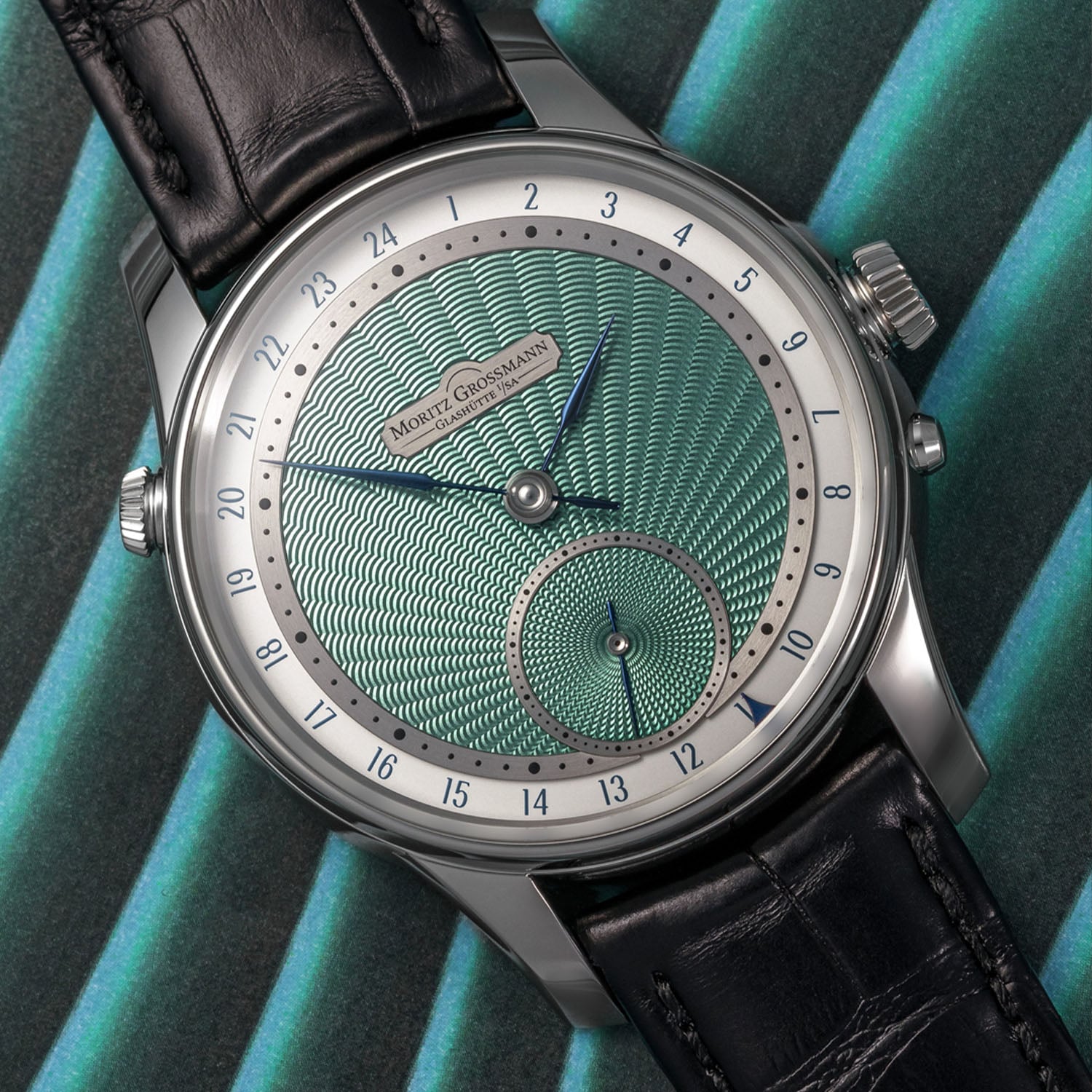 Quick Facts – 41mm x 11.85mm – 3-part stainless steel case, polished – sapphire crystal front & back – 2-crown set-up with start-pusher – solid silver dial with guilloché decor and matte green finish – heat-eannealed hands – 24-hour scale reference time with peripheral indicator – Calibre 100.8, in-house – manual winding – hand-finished – 18,000vph – 42h power reserve – black alligator leather strap with prong buckle – limited to 8 pieces – EUR 52,800