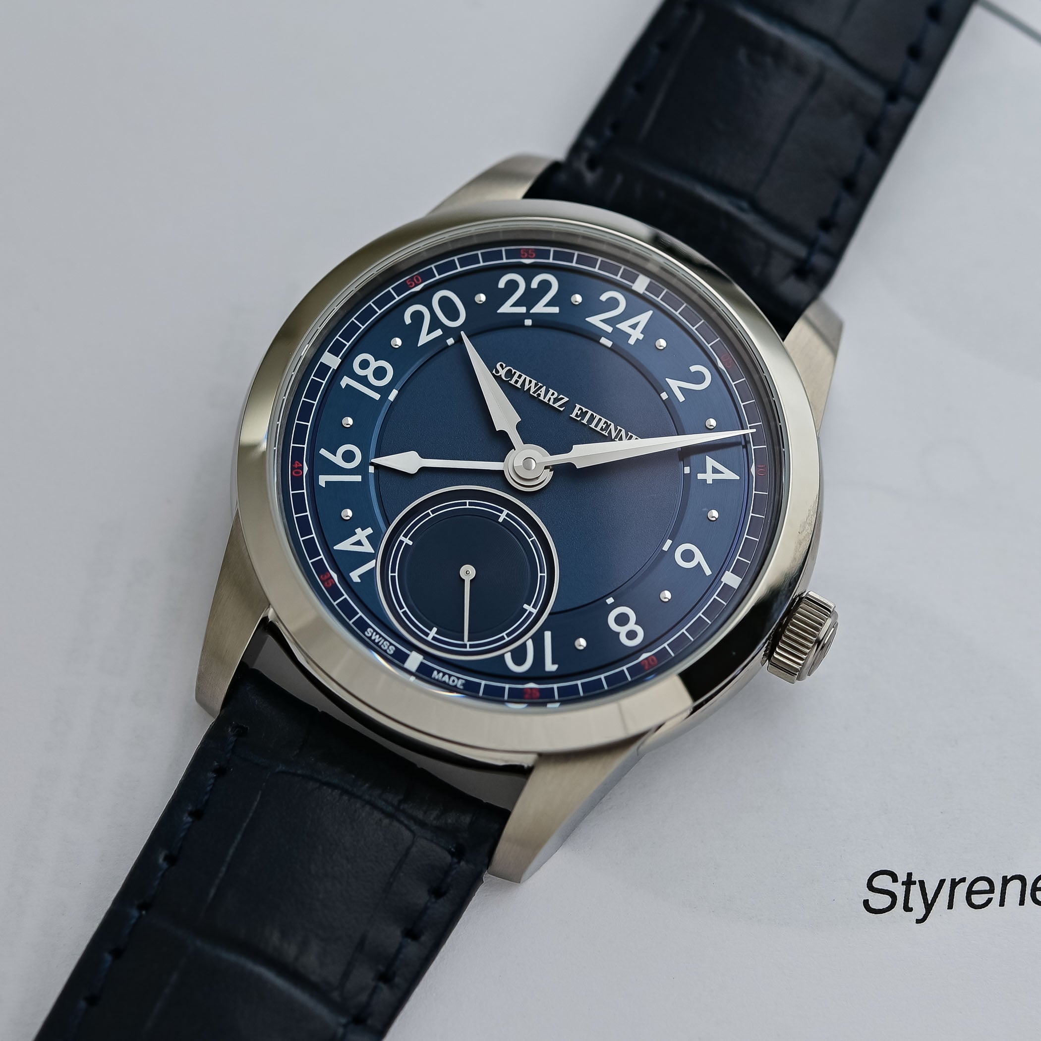 The 1902 range is Schwarz Etienne’s youngest collection and offers a stylish and slightly contemporary take on the classical dress watch. Next to the Petite Seconde and Réserve de Marche, it welcomed a titanium GMT model in late 2025. Available in silver or blue, it features a multi-level dial with a distinct 24-hour scale and an elegant set of hands to tell time both at home and abroad. The splendid in-house Calibre ASE 320.00 is a modular micro-rotor automatic, with an independently adjustable GMT hand. Worn on a blue alligator leather strap with a signed titanium pin buckle, it retails for CHF 19,850 excl. VAT.