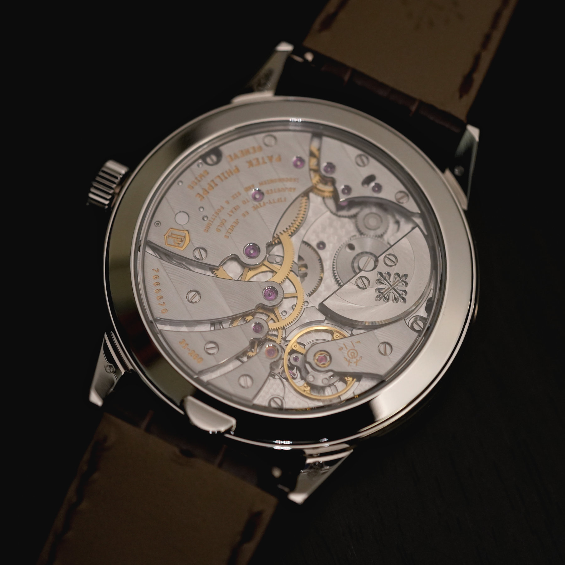 Quick Facts – 41.3mm x 11.07mm – 950 platinum case, fully polished – sapphire crystal front & back – 30m water-resistant – opaline rose-gilt dial – charcoal grey indices & hands – day-date-month aperture – moon phase display with running seconds – leap-year – day/night indicator – calibre 31-260 PS QL, in-house – micro-rotor automatic – Patek Philippe seal – 28,800vph – 55h power reserve – alligator leather strap with platinum fold-over clasp – CHF 120,000