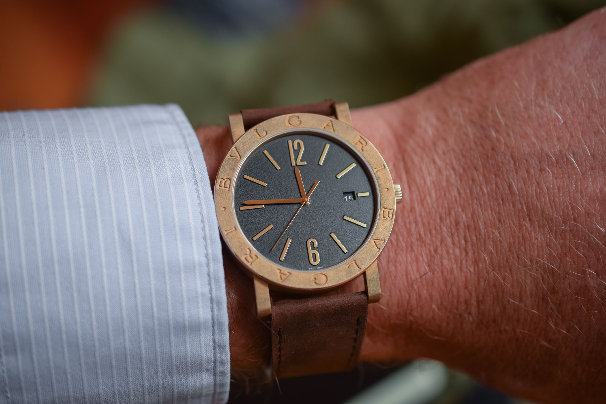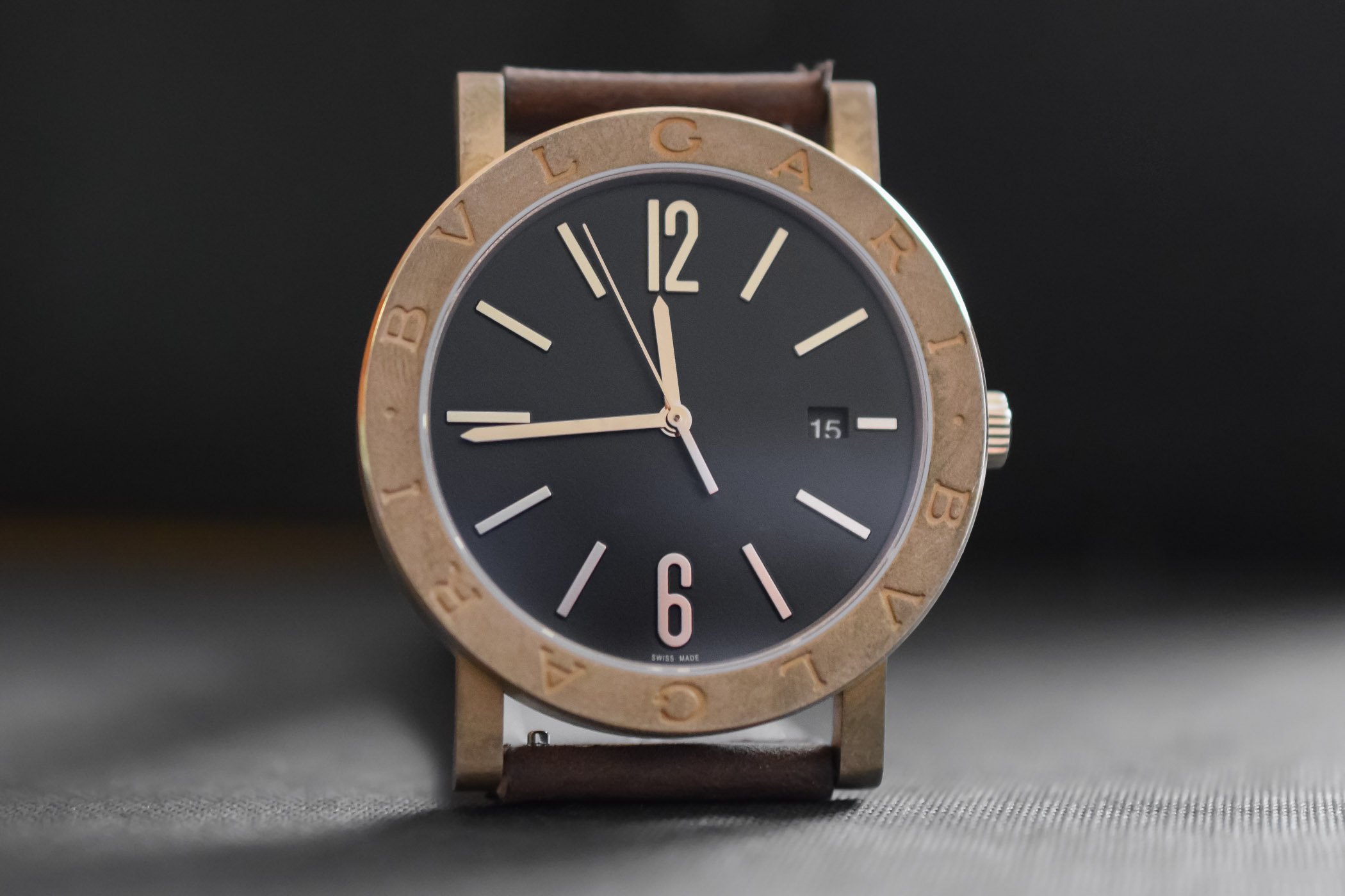 The Bvlgari Bvlgari is worn on a chestnut brown calfskin leather strap for the bronze version, a black calfskin leather strap for the DLC-steel-and-bronze version and a rubber strap for the DLC-steel version. It is fitted with a quick-release spring bar system to easily remove and exchange it. It is delivered with a grained leather pouch containing a complementary leather strap.