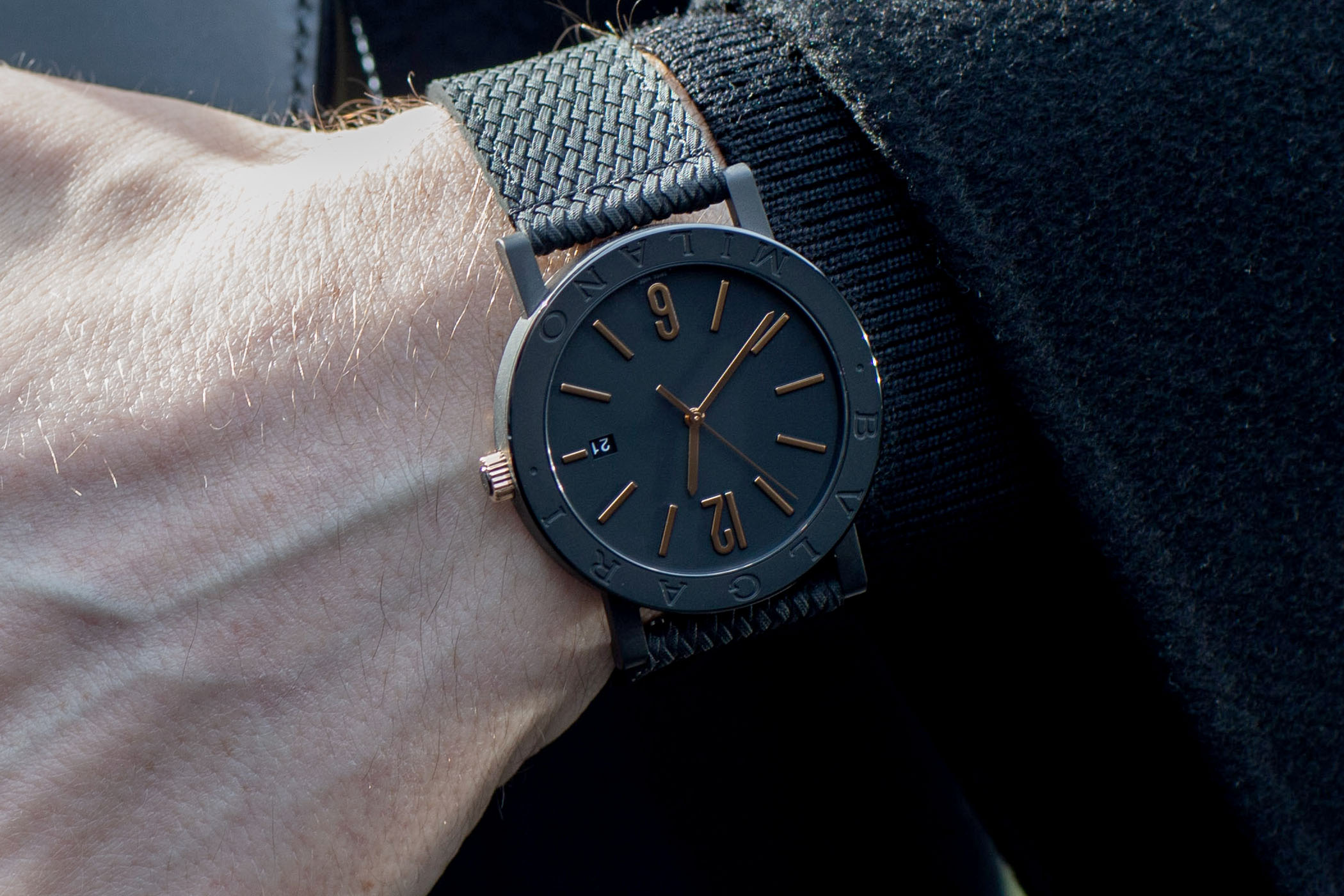 The case of the Bvlgari Bvlgari retains its sleek cylindrical shape inspired by the columns of ancient Rome monuments. Over the years, the design has slightly changed, the watch becoming bolder, and crafted in stealth materials. The case is also larger than in the past, now measuring 41mm in diameter. For this Cities Editions 2020 the case is matte blasted stainless steel with a black DLC coating. An 18k rose gold crown creates contrast.