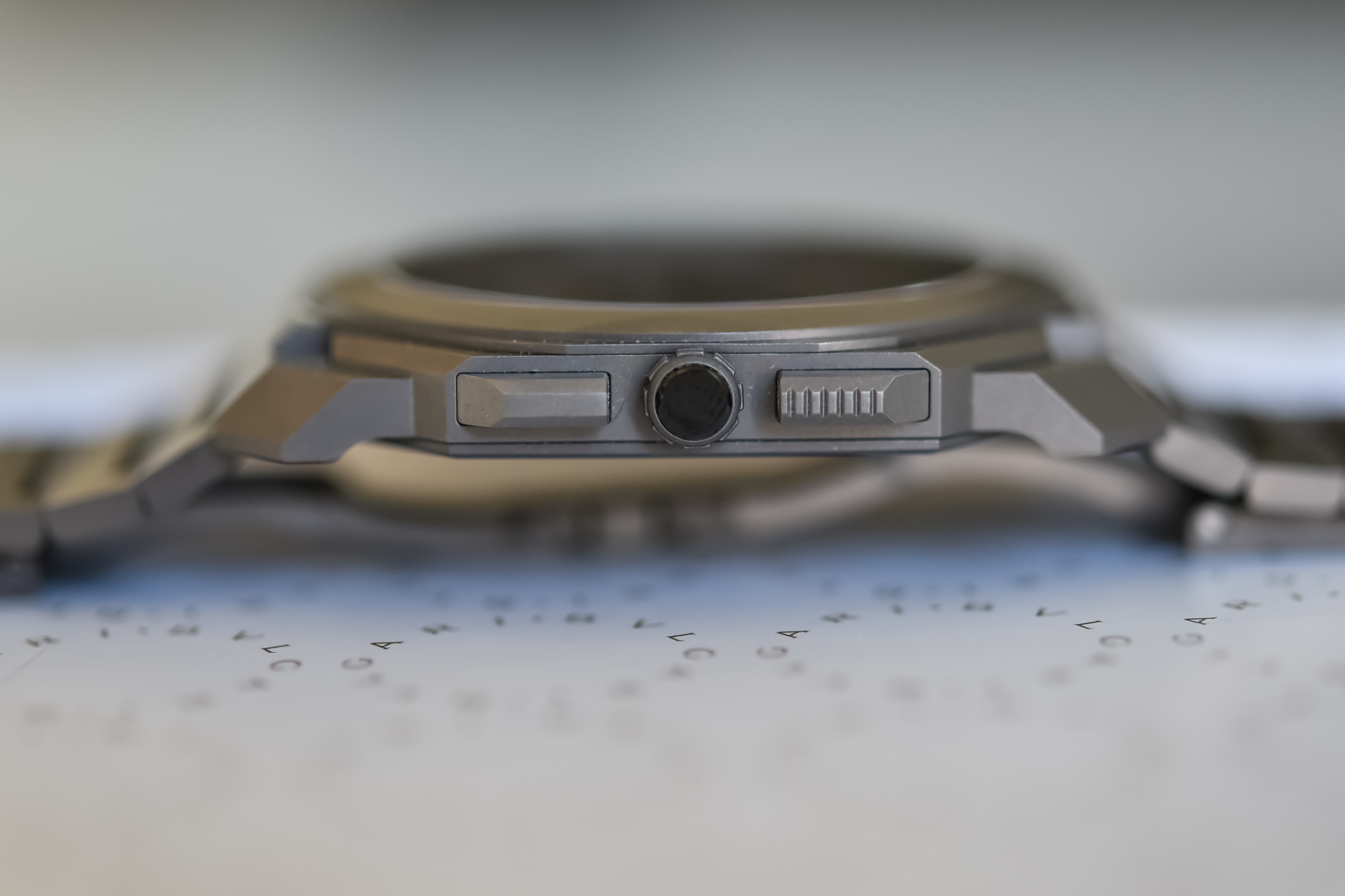 Don’t be fooled by the two pushers on the side of the case, the chronograph is a single push-piece mechanism. The 2 o’clock pusher with its special grip pattern is used to successively start, stop and reset the chronograph. The 4 o’clock pusher allows you to drive a column/star wheel to select the crown function and switch between setting and winding options.
