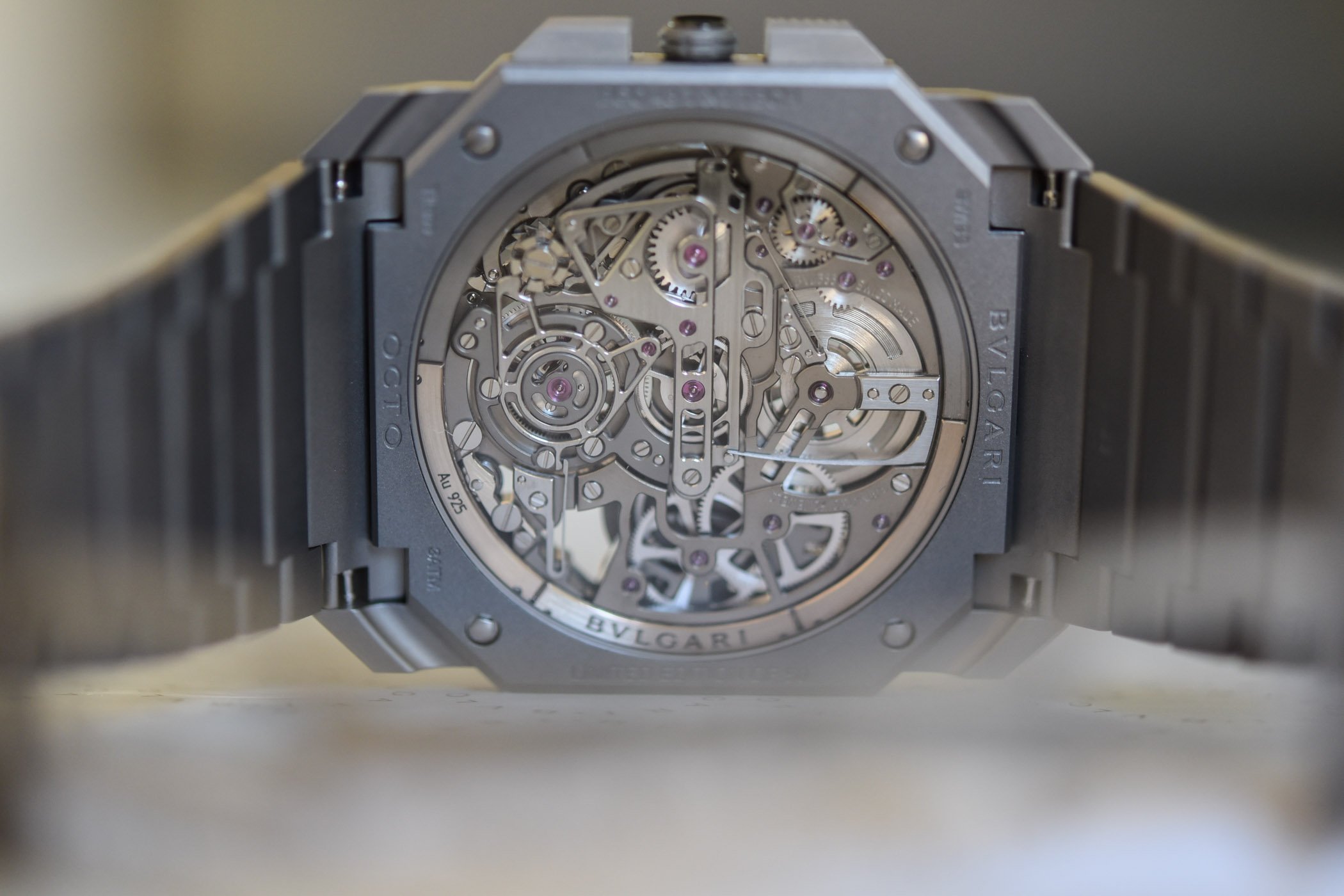 Inside the architectural Octo case, the automatic ultra-thin skeleton movement is wound by a peripheral rotor – rather than a centrally mounted oscillating weight or a micro-rotor, two solutions that inevitably add thickness. From a technical perspective, the movement is based on the Bvlgari ultra-thin tourbillon. The chronograph mechanism grafted on this movement is different from the one found in the Octo Finissimo Chronograph. This required several adjustments. With this new construction, only two ball bearings are now used as the movement relies on more traditional jewel bearings and the tourbillon regulator itself is no longer a flying tourbillon.