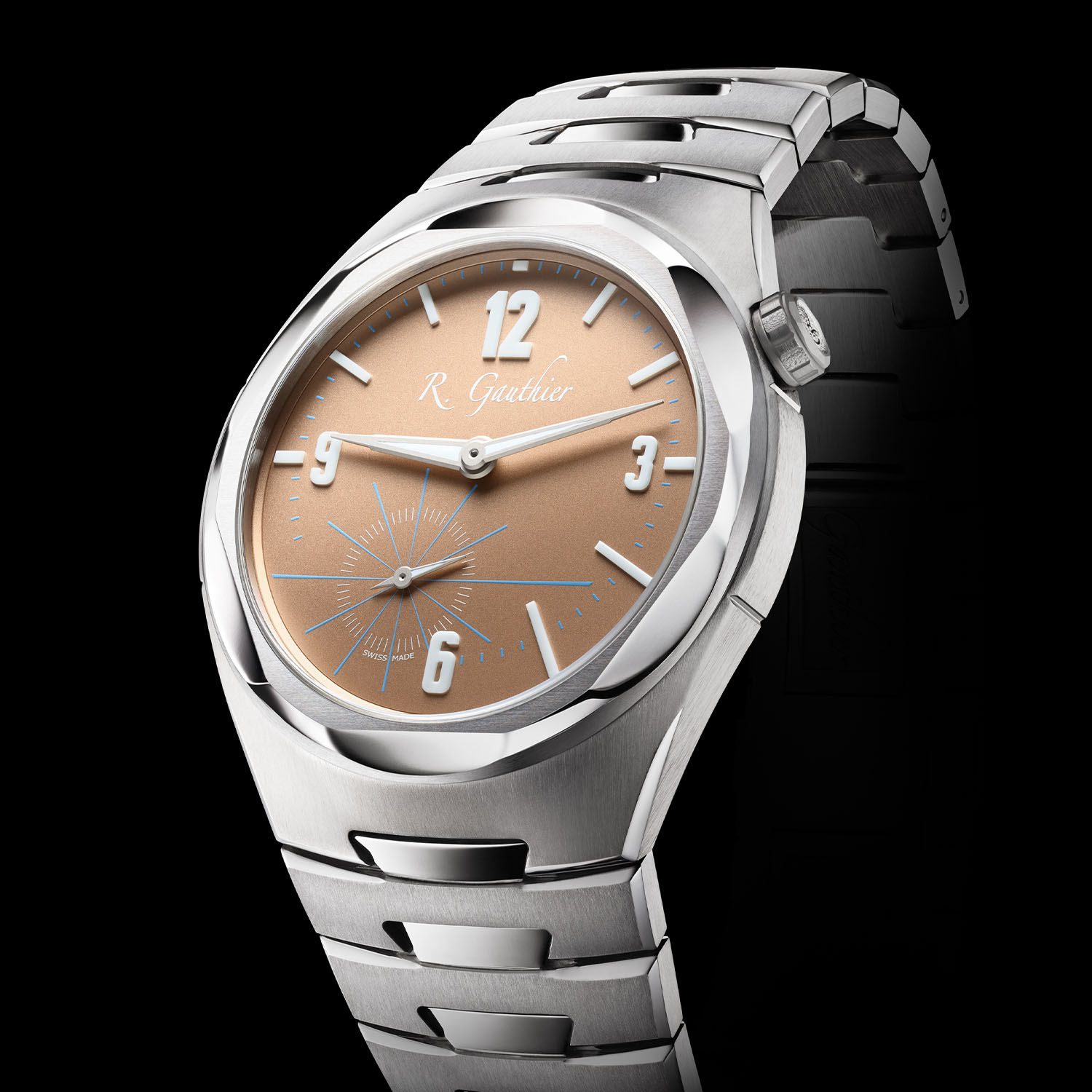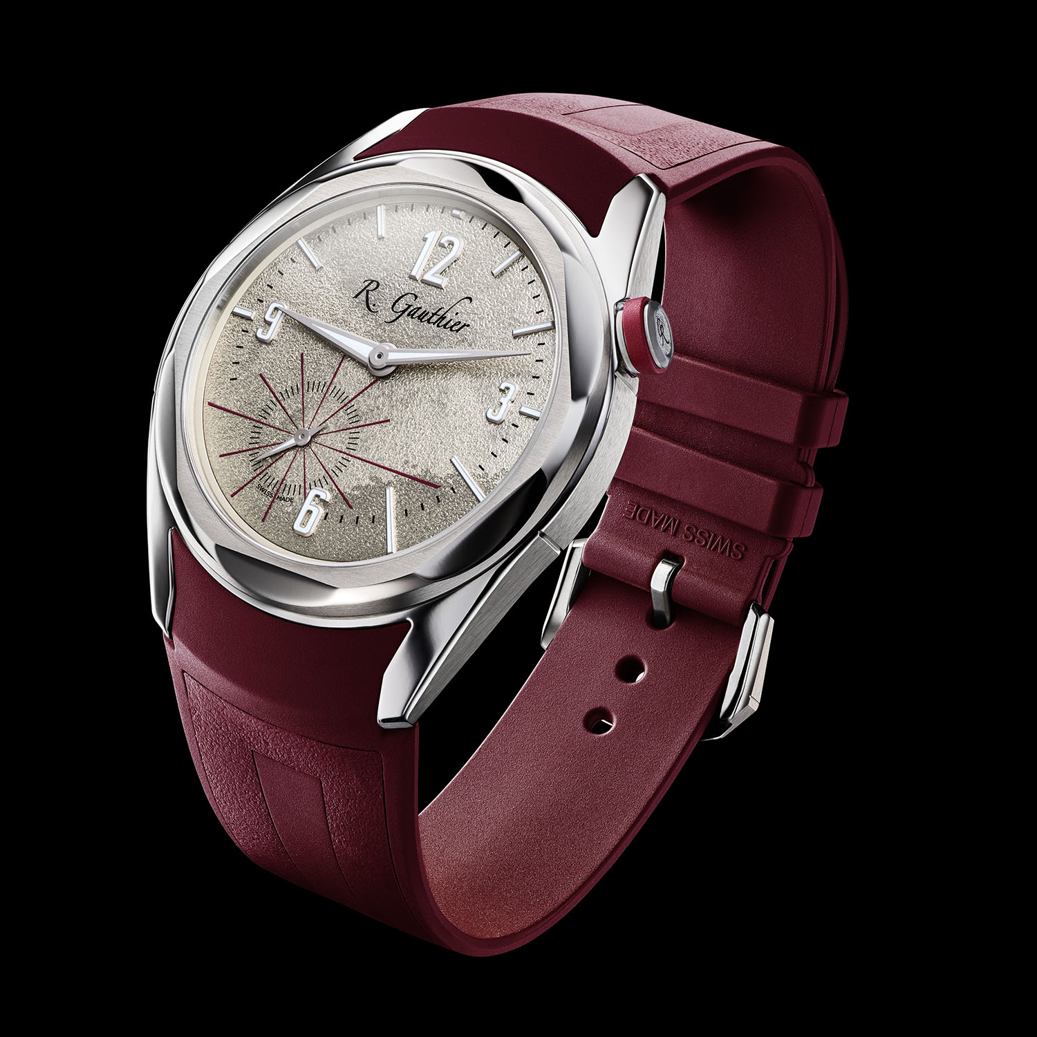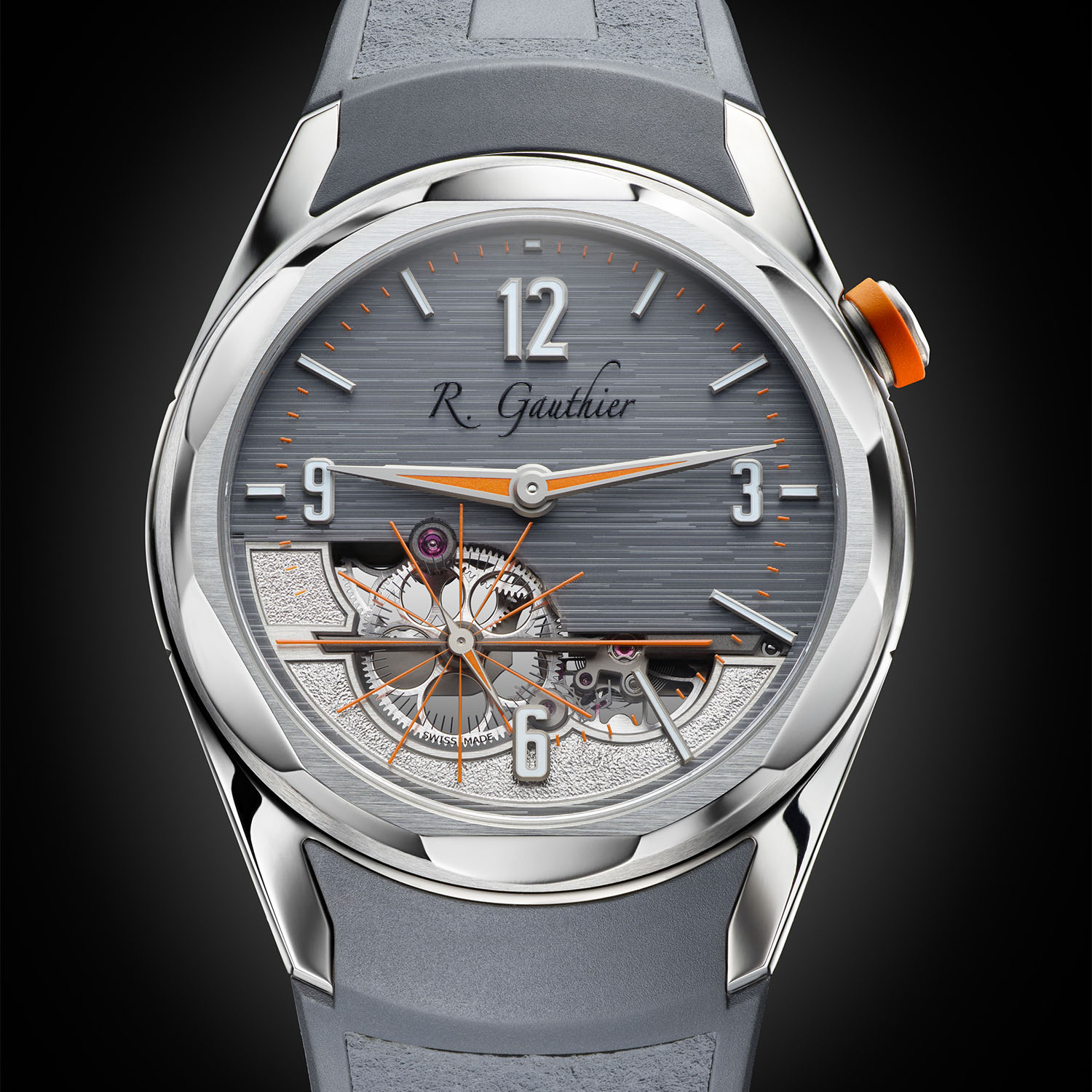 The exhibition caseback echoes this distinctive silhouette. The sandblasted titanium dial featured a slightly off-centred handset and running seconds sub-dial at 7 o’clock, accented with red details on both the sub-dial and the crown positioned at 2 o’clock. This model also debuted a new Gauthier movement with titanium finger-like bridges, enhancing the modern aesthetic and completing the highly appealing overall look that would shape the collection.