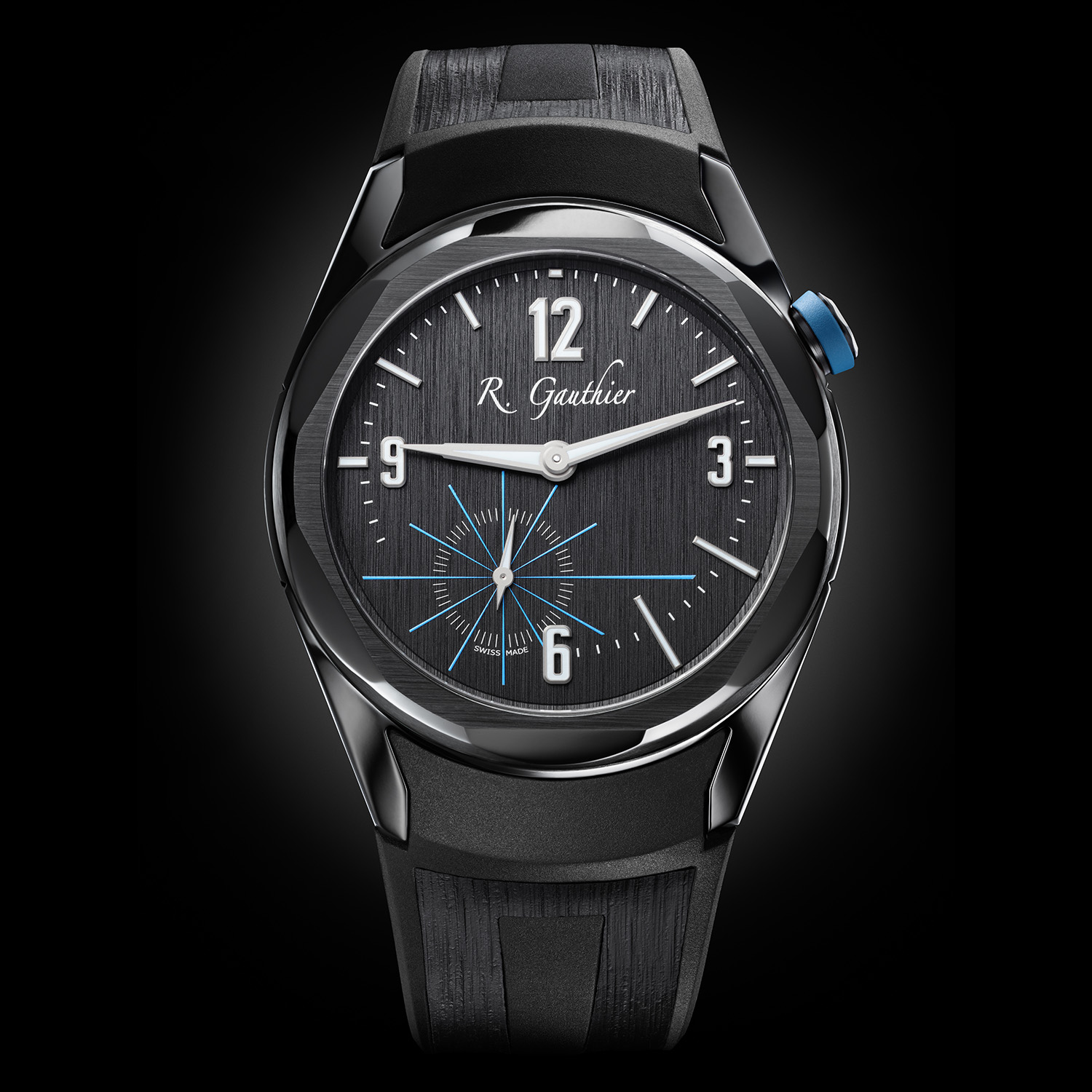 In 2022, the bold and aggressive C by Romain Gauthier Titanium Edition Two played with contrasting colours. It featured a titanium case and dial coated in black ADLC, complemented by red Super-LumiNova on the hands, indices, sub-dial markers and a red rubber ring on the crown. Edition Two was followed by the C by Romain Gauthier Titanium Edition Three, which introduced subtle ice-blue decorations for a more relaxed feel.