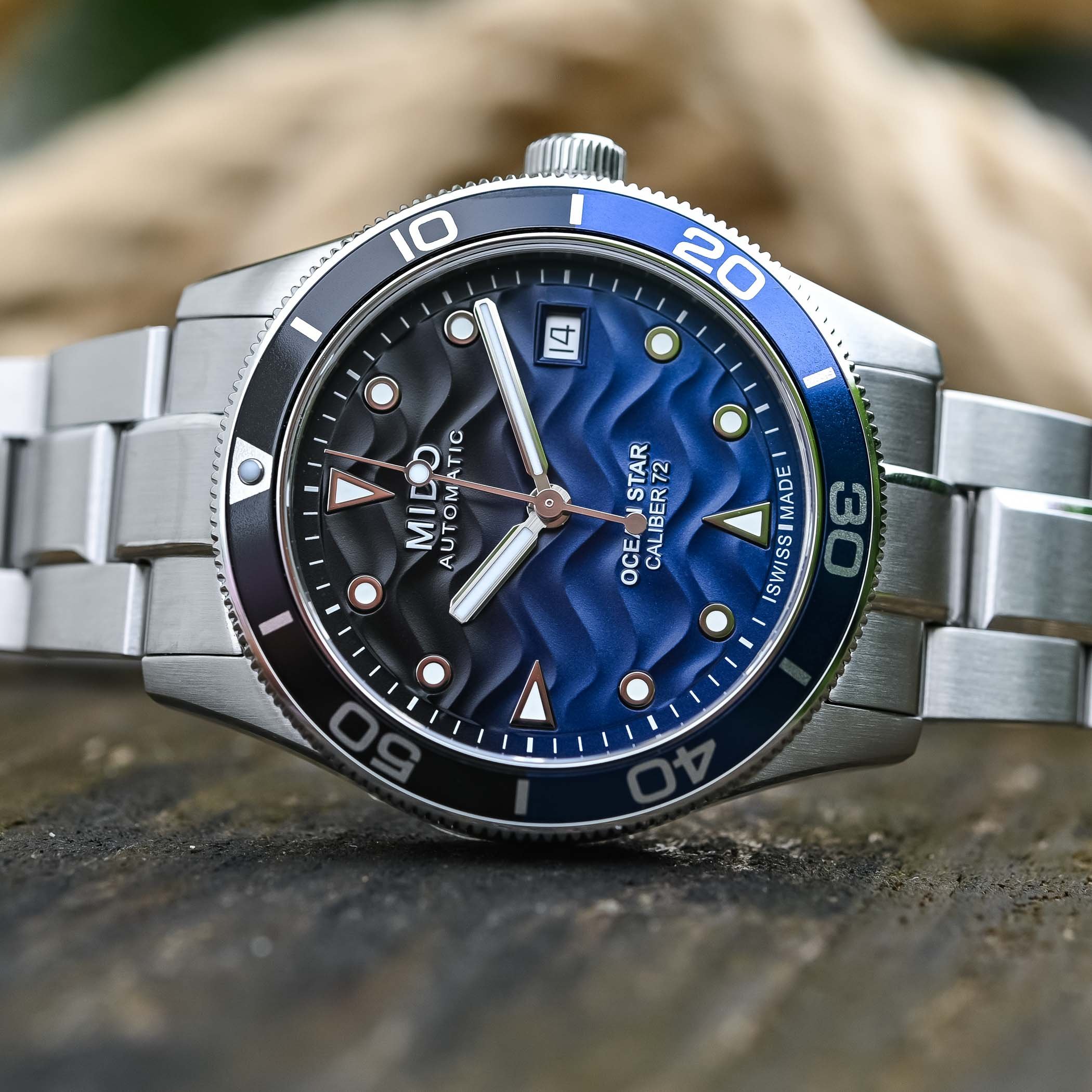Quick Facts – 39mm x 10.5mm – stainless steel case, brushed & polished – unidirectional rotating bezel with two-tone insert – screw-down crown – 200m water-resistant – black to blue gradient dial with wave-like pattern – applied markers & hands with SLN – Mido Calibre 72 (ETA A31.111 base) – automatic winding – 25,200vph – 72h power reserve – stainless steel bracelet with folding clasp with diver’s extension – permanent collection – EUR 1,190
