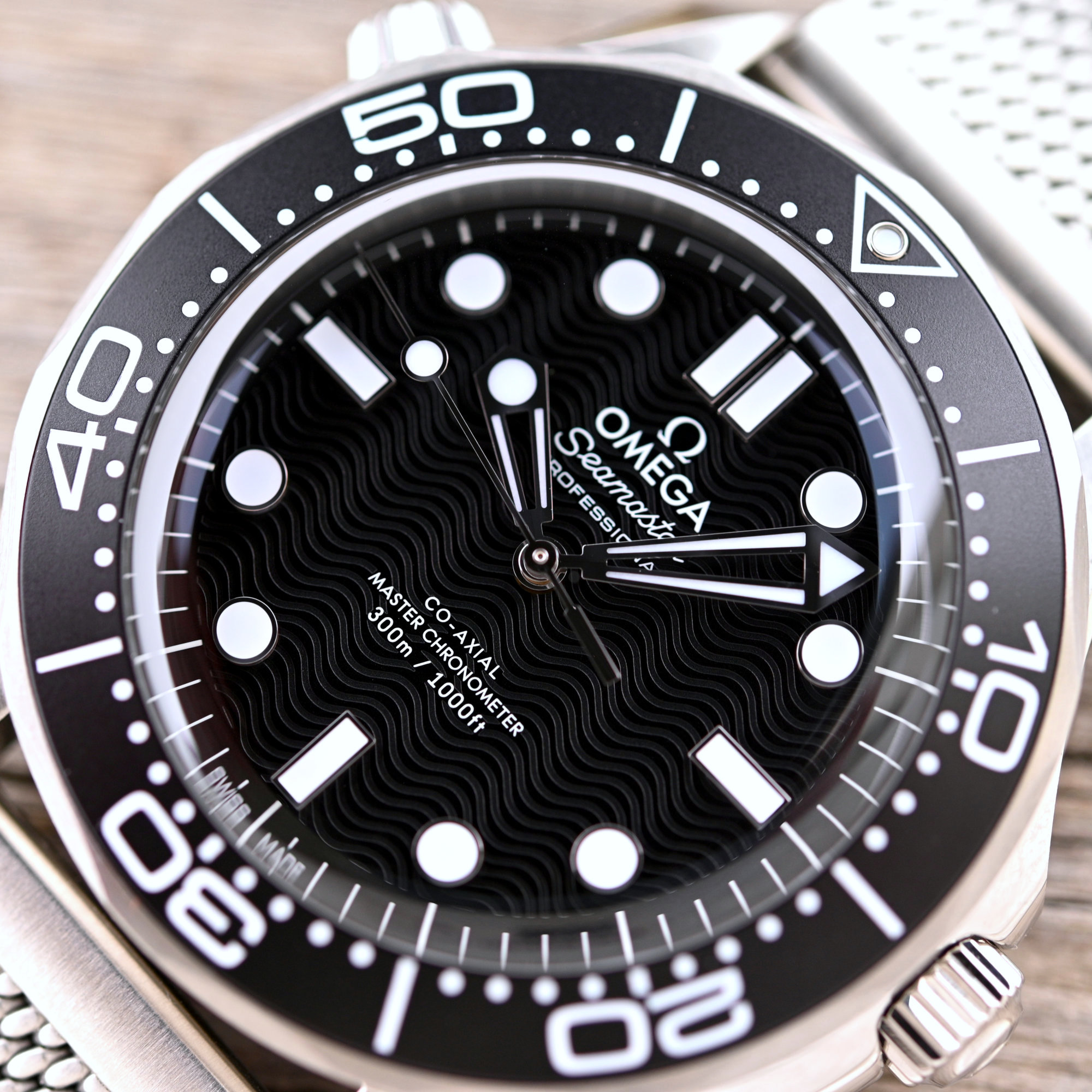 Quick Facts – 42mm x 13.8mm – stainless steel case, brushed & polished – steel bezel with black aluminium insert – screw-down crown – helium escape valve – sapphire crystal front & back – 300m water-resistant – matte black dial with wave-like pattern – markers & hands with SLN – Calibre 8806, automatic – co-axial escapement – Master Chronometer – 25,200vph – 55h power reserve – steel mesh bracelet or black rubber strap with folding buckle – EUR 6,600 (rubber) – EUR 7.200 (mesh bracelet)