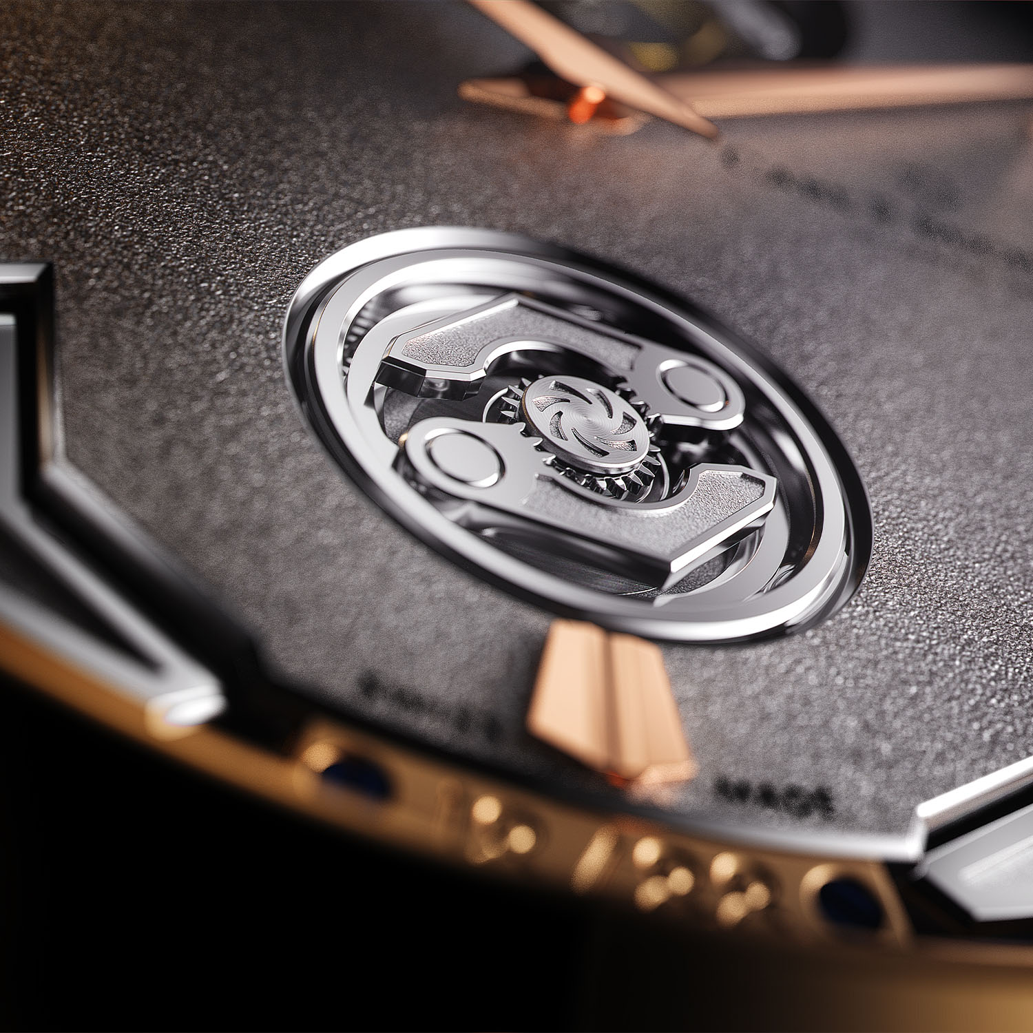 In watch movements, rotating parts are usually guided by centrally mounted pivots fixed on the plate or bridges. hHghly original, the Manero Minute Repeater Symphony combines three peripheral mountings whose parts rotate on their own periphery and are guided by rollers, also on the periphery. First, the movement features a peripheral 18k peripheral rotor. The Tourbillon is also peripherally mounted and literally seems to be floating in space, just like for the Manero Double Peripheral. Last but not least, the minute repeater mechanism is also regulated by a governor featuring a peripheral mounting. This patented regulator is visible dial side and rotates in between three low-friction ceramic ball bearings.