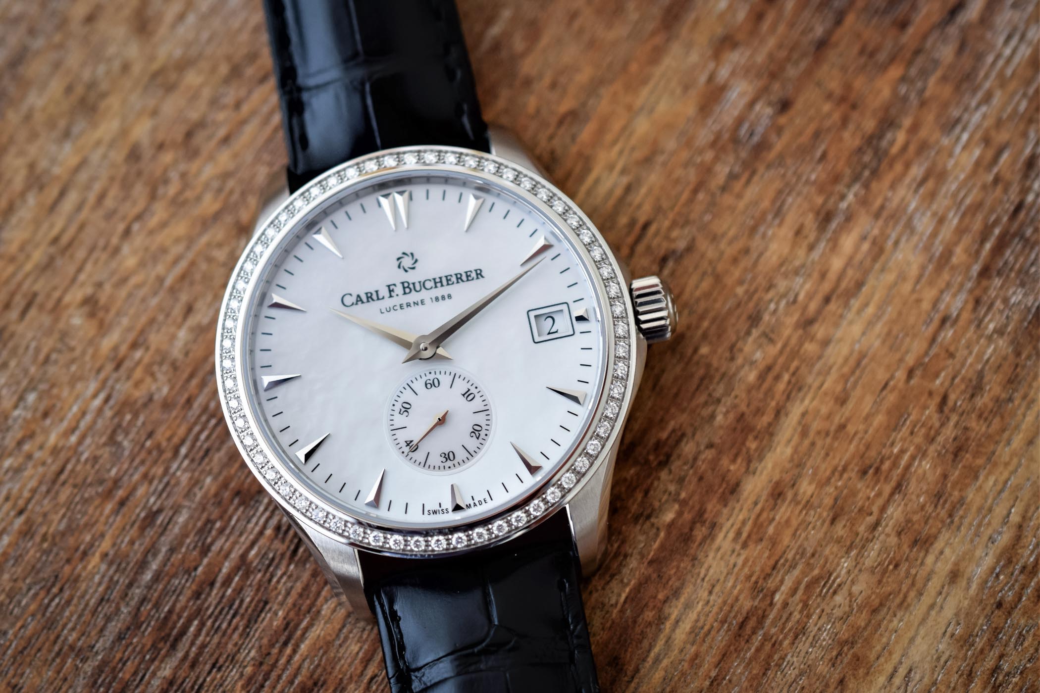 This year, Carl F. Bucherer unveiled the Manero Peripheral watch for women, with central hour and minute display and a small seconds sub-dial at 6. It also features a highly readable date via an aperture at 3. Powered by the Caliber CFB A2050 movement, the newest pieces are offered in what the brand calls velvet brown or snow-white color schemes, with color-coordinated mother-of-pearl dials and Louisiana alligator straps. The stainless steel bezel of the 40mm watch is set with 60 diamonds.