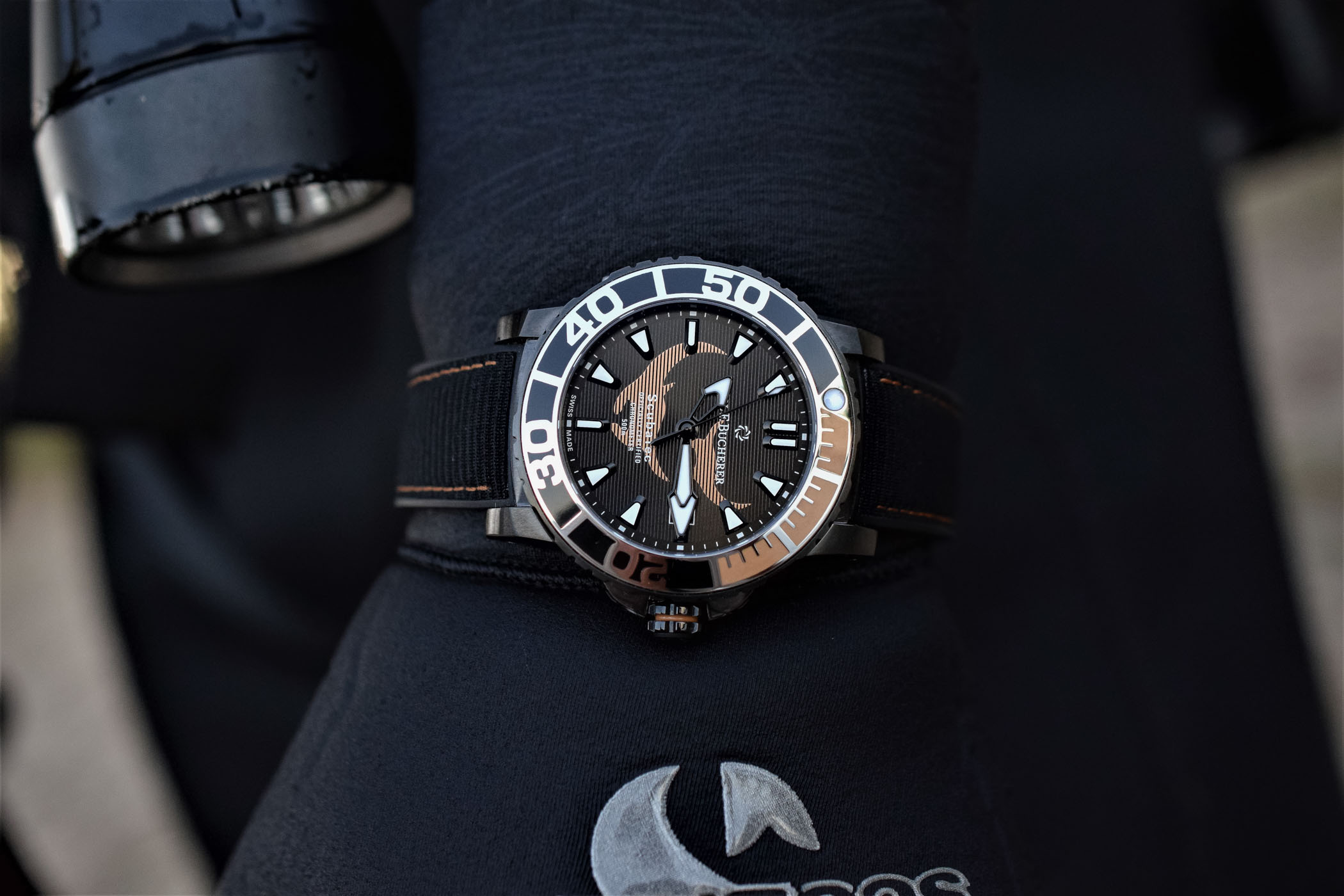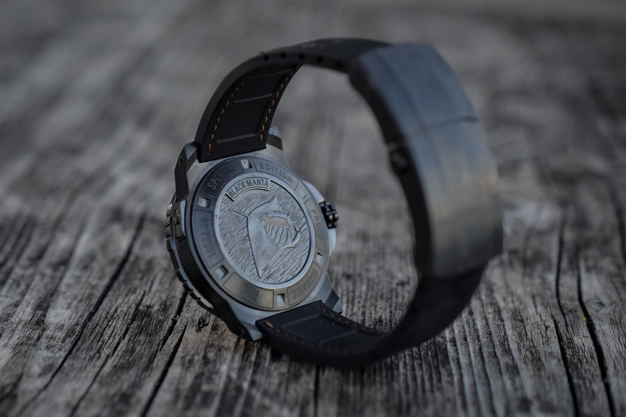 In tune with the environmental theme of the watch, the Carl F. Bucherer Patravi ScubaTec Black Manta Special edition is worn on a rubber and textile strap mostly made of recycled PET. It is secured to the wrist by a DLC-coated titanium folding buckle with a divers’ extension. Price is set at CHF 6,900.