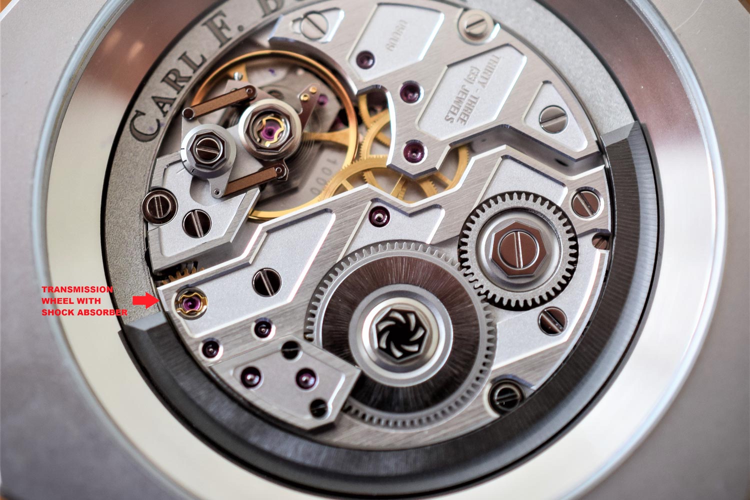 Over the past years, CFB initiated a programme to research, develop and produce its own movements and technical solutions. In 2009, CFB presented the calibre A-1000 with a peripheral winding system. Instead of a centrally mounted rotor, the movement featured an innovative tungsten annular winding mass mounted and swinging around the movement. The concept relies on three small DLC-coated rollers with ceramic ball bearings, driving the peripheral rotor. The ceramic ball bearings require no lubrication and winding is bidirectional: the rotor supplies energy when turning in either direction, thanks to two clutch-wheels with clamp rollers (based on friction).