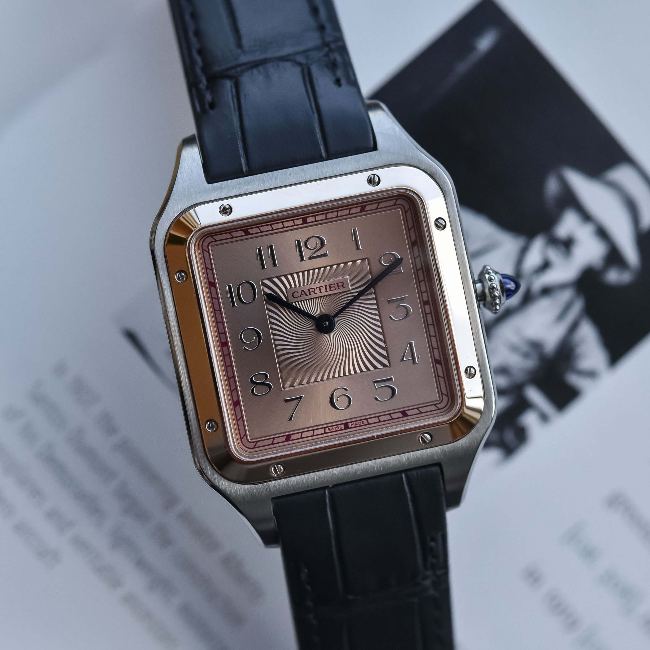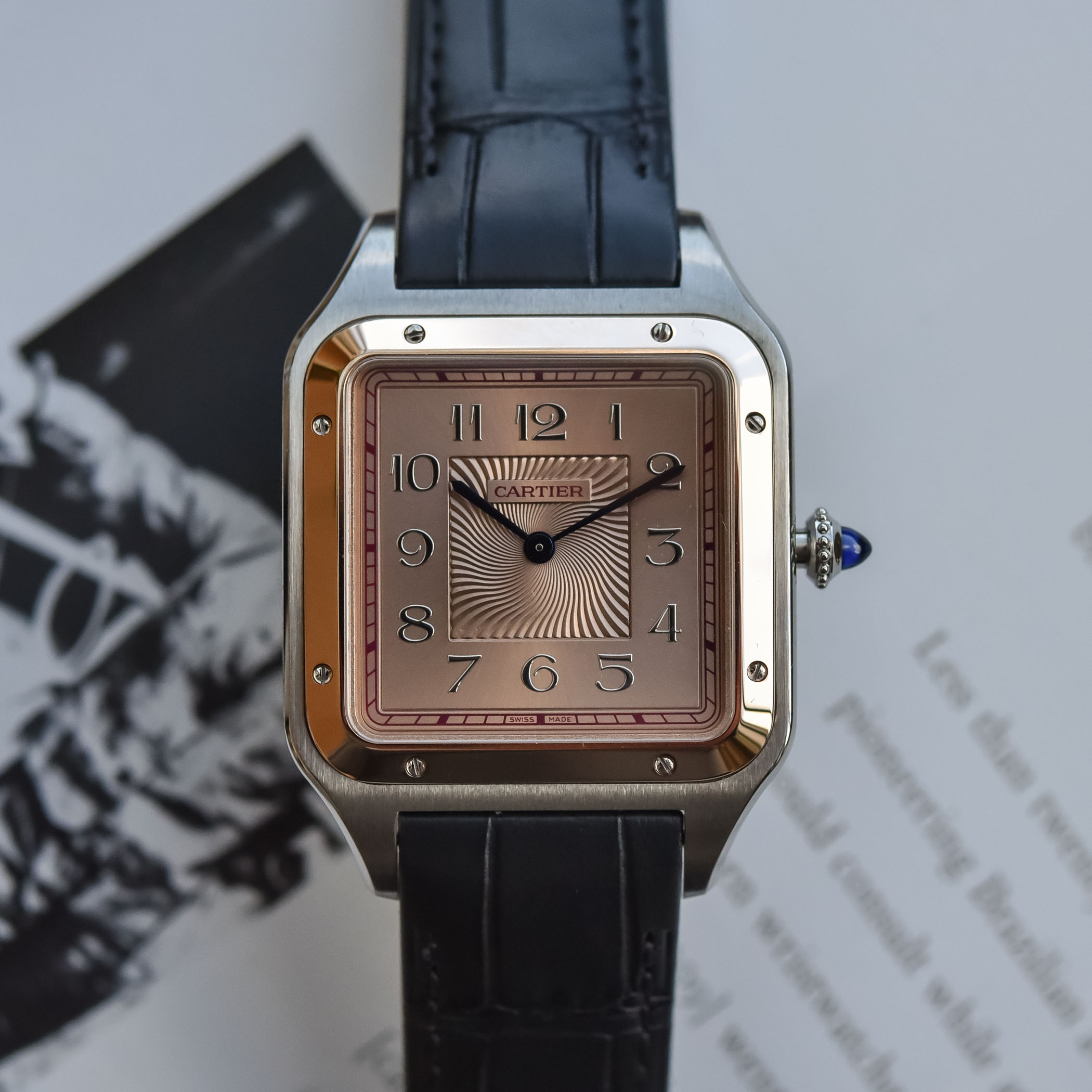 This year, the Parisian brand introduces two new limited edition models based on the Cartier Santos-Dumont XL Hand-Wound. First, and not presented here, is a costly platinum version with a light blue dial (reference CRWGSA0048, limited to 100 pieces). Second, and far more accessible (and probably also even more visually attractive), is this steel and rose gold model with a whole new dial design (reference CRW2SA0025).