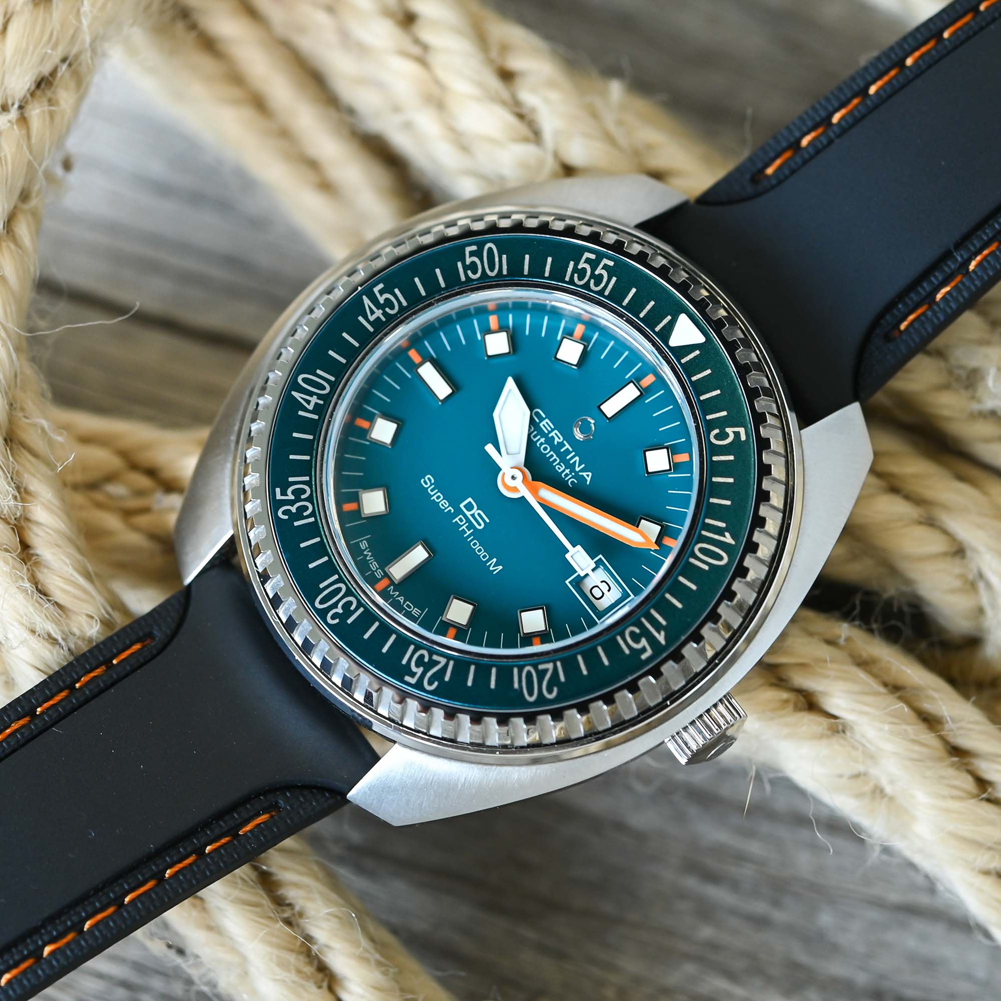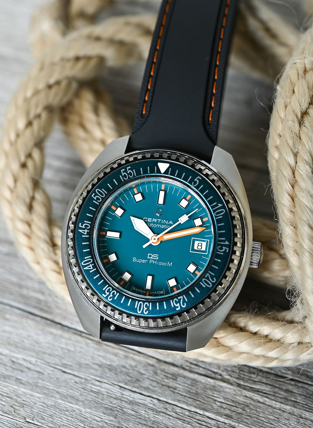 And if you’re wondering about the presence of a date… Remember that the original Certina DS-2 Super PH1000M was used in the 1970 Tektite II programme, which saw five aquanauts living and conducting research in a diving base on the seabed for 10 to 20 days. In this context, the date function was essential. In addition, its white background echoes the marker at 9 o’clock and feels quite nicely integrated. For once, I do not mind this feature too much.