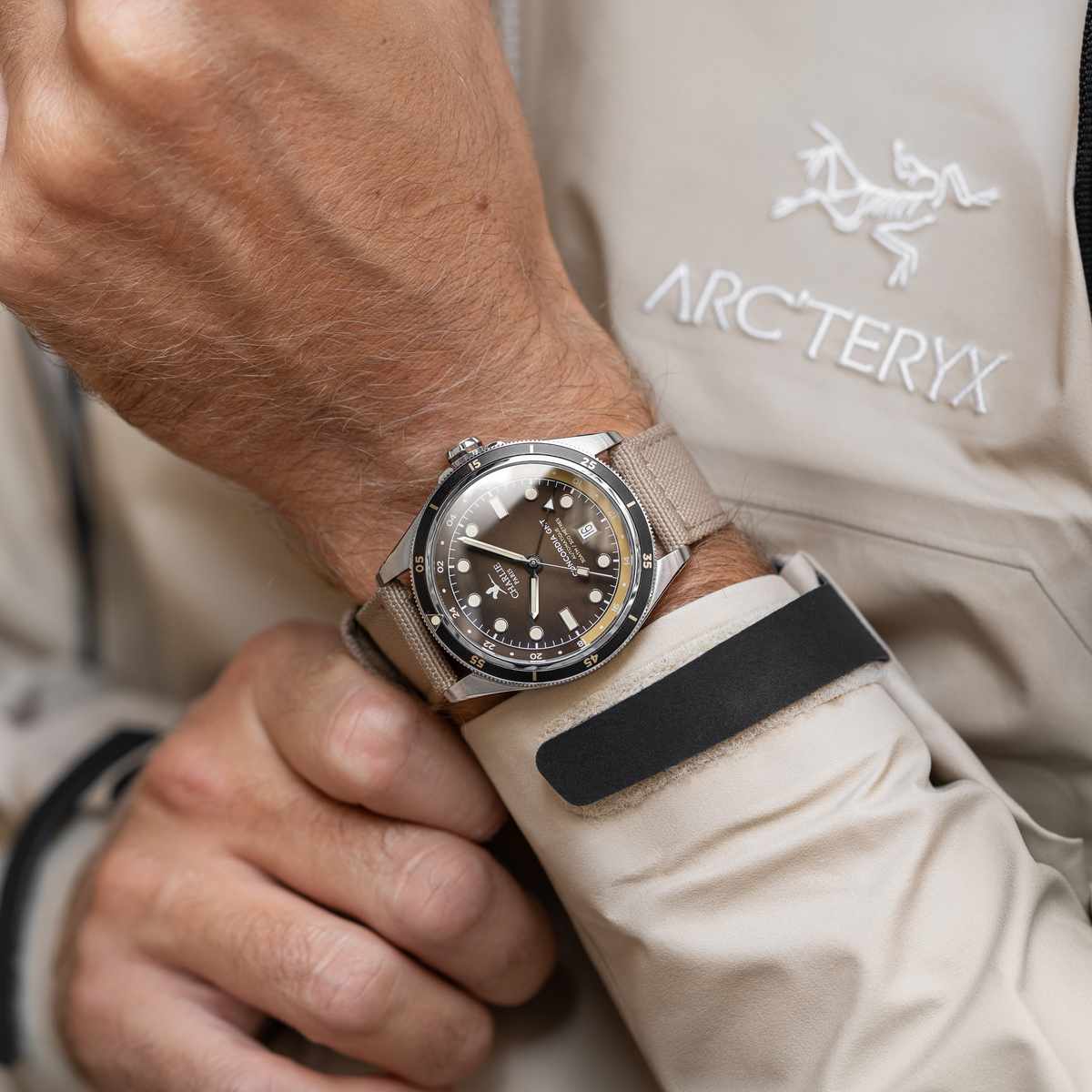 Moving to the dial, the traveller’s side of this watch appears with a classic combination of a central 24-hour hand (independent office-like GMT) and a 24-hour, two-tone inner flange to read the second time zone and differentiate day from night. Large applied markers and hands, all generously filled with SLN, as well as a date at 6 o’clock, complete this classic display. As said, four editions of the Concordia GMT are available: sandblasted blue with white accents, sandblasted black with white accents, Dune with matte brown gradient dial with cream-toned lume and Latitude 0, probably the coolest of the lot, with a smoked green dial with bark texture and cream-toned lume.
