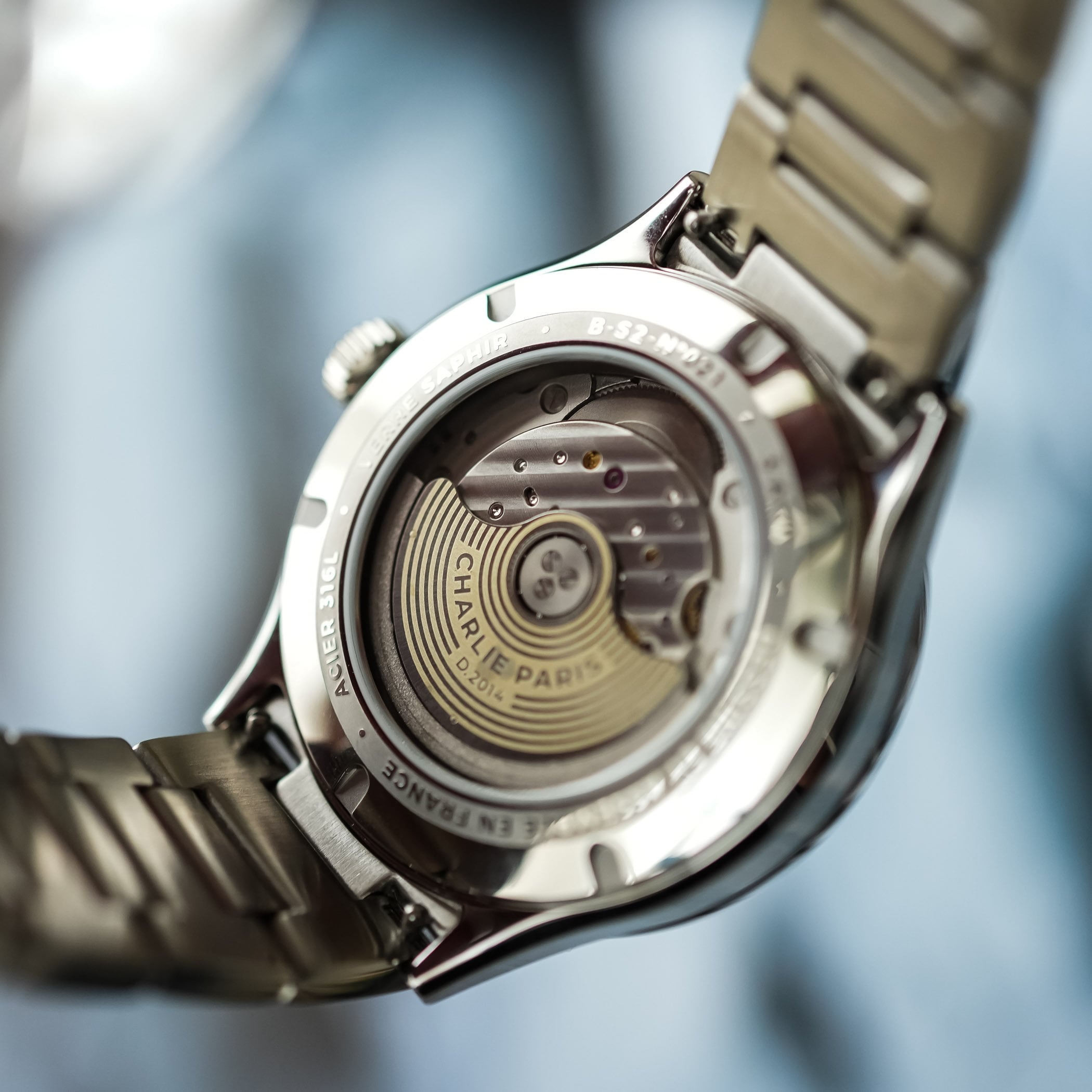 The stainless steel case is polished with brushed sides and comes in at a very wearable 40mm in diameter and 11mm in height (lug-to-lug is 46mm). There are several interchangeable strap options (with quick-release levers), from leather to Milanese mesh to the one we have on-hand, a matching three-link bracelet with polished centre links. Sapphire crystals are visible on both sides, with the front crystal coated with an anti-reflective coating; water-resistance is 30 metres.