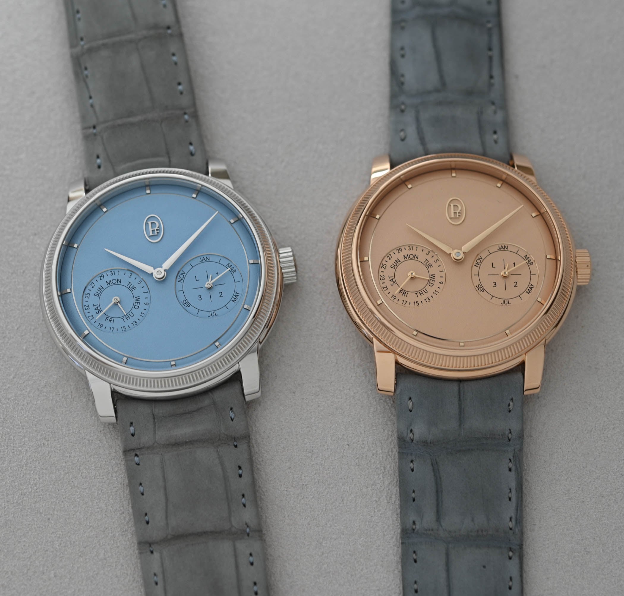 Quick Facts – 40.6mm x 10.9mm – platinum or rose gold case, brushed & polished – sapphire crystal front & back – 30m water-resistant – grained Morning Blue or Golden Hour dial – gold hands & markers – calibre PF733, in-house – manual winding – 265 components – 28,800vph – 60h power reserve – hours, minutes, coaxially-arranged QP displyay with day and date at 8′ & month and leap year at 4′ – grey nubuck alligator leather strap with pin buckle – limited to 50 pieces each – CHF 85,000 (gold) or CHF 92,000 (platinum)