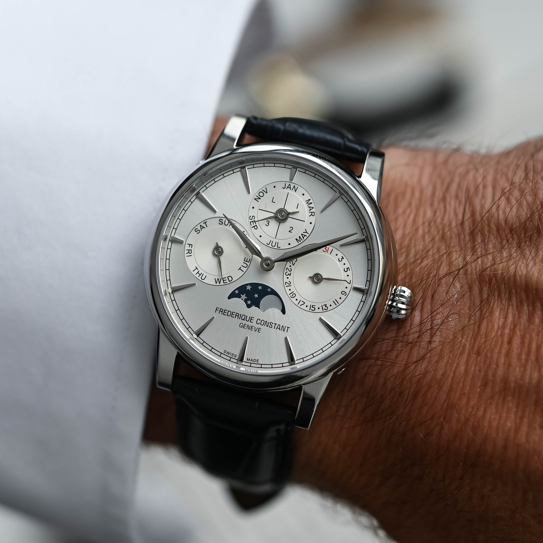 Quick Facts – 40mm x 12.1mm – stainless steel or yellow gold case, polished – onion-style crown – 50m water-resistant (30m in gold) – blue, silver, salmon or black onyx dial (yellow gold only) – Dauphine hands – snailed subdials (steel case only) – Manufacture calibre FC-776, automatic – 28,800vph – 72h power reserve – hours, minutes, day, date, month, leap year, moon phase – alligator leather strap with folding clasp – limited to 37 pieces in gold – EUR 9,995 or EUR 29,995 (gold)